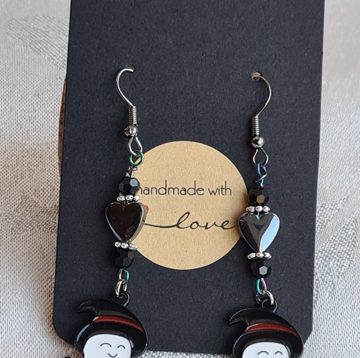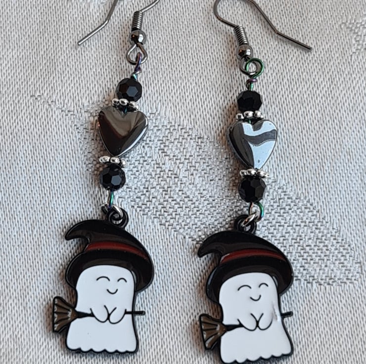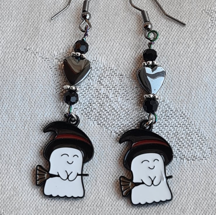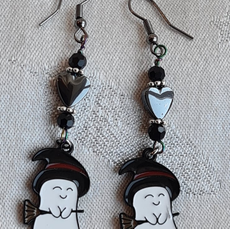 Cute little Ghost charms dressed for Halloween in their Witches hats and Broomsticks. With glass beads and Haematite hearts all dangling from dark-tone gun-metal tone ear wires.