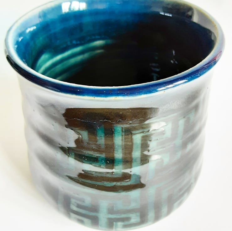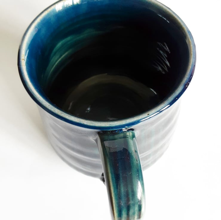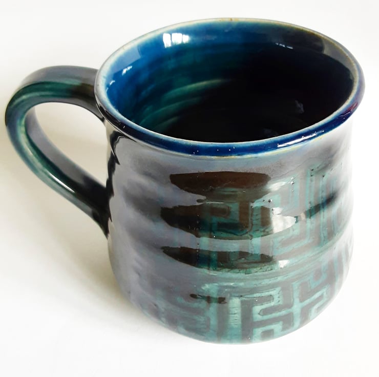 Glazed in blue glazes with a pattern on the mug.