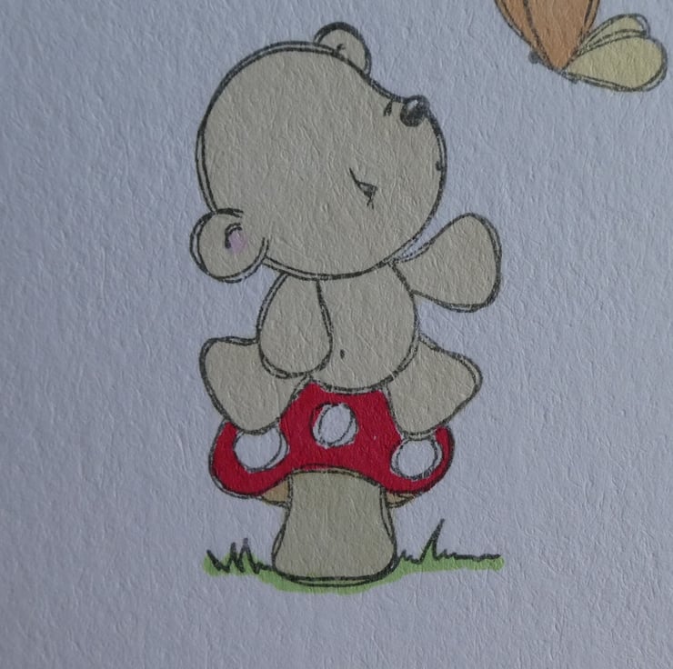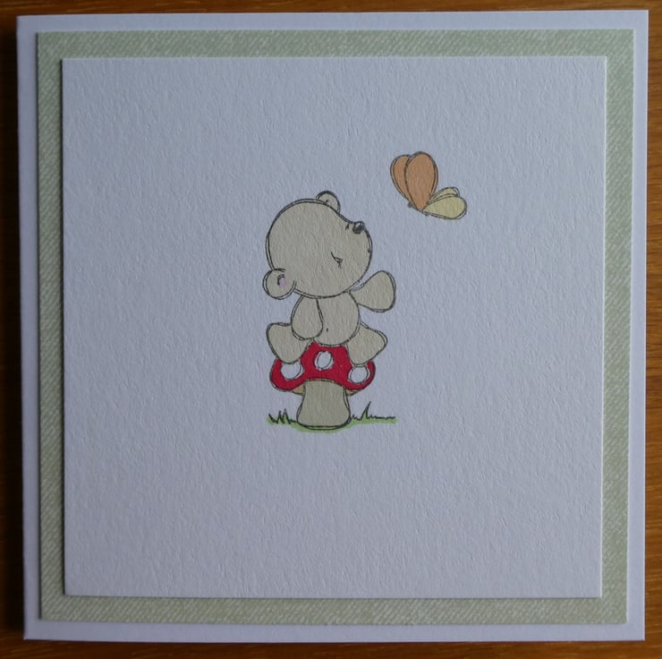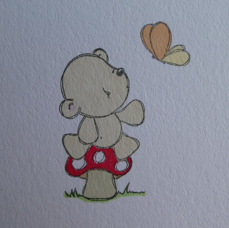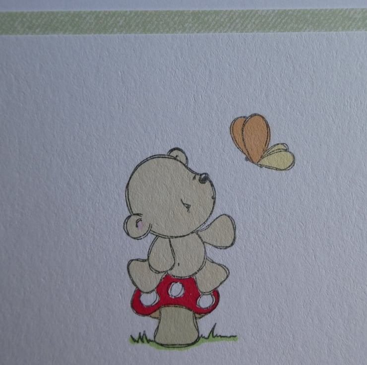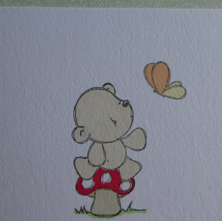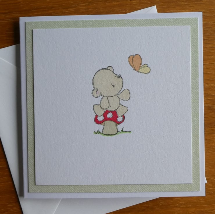The card has been hand stamped with a little bear sitting on a toadstool and looking at a butterfly. It has been hand coloured in pastel shades of brown, red, orange and lemon.