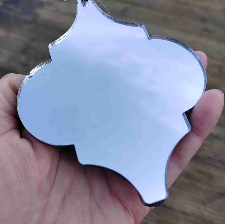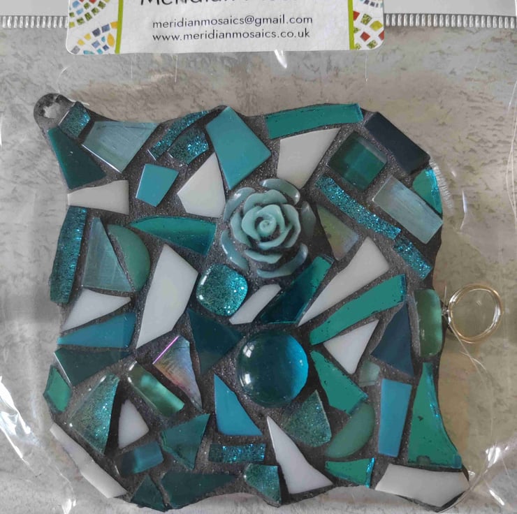 Mirror backed mosaic suncatcher, perfect for casting reflections in your garden. Hang from a tree, bracket or hook or indoors from a window treatment. Spins on invisible thread to create interest all year round. Fully weatherproof. Size 12cm.