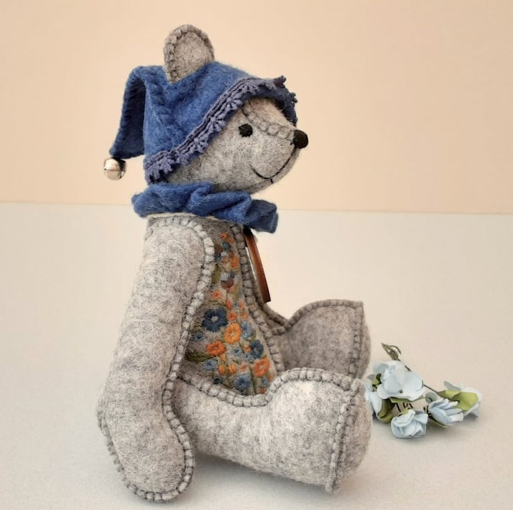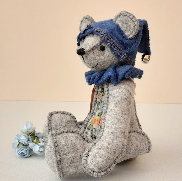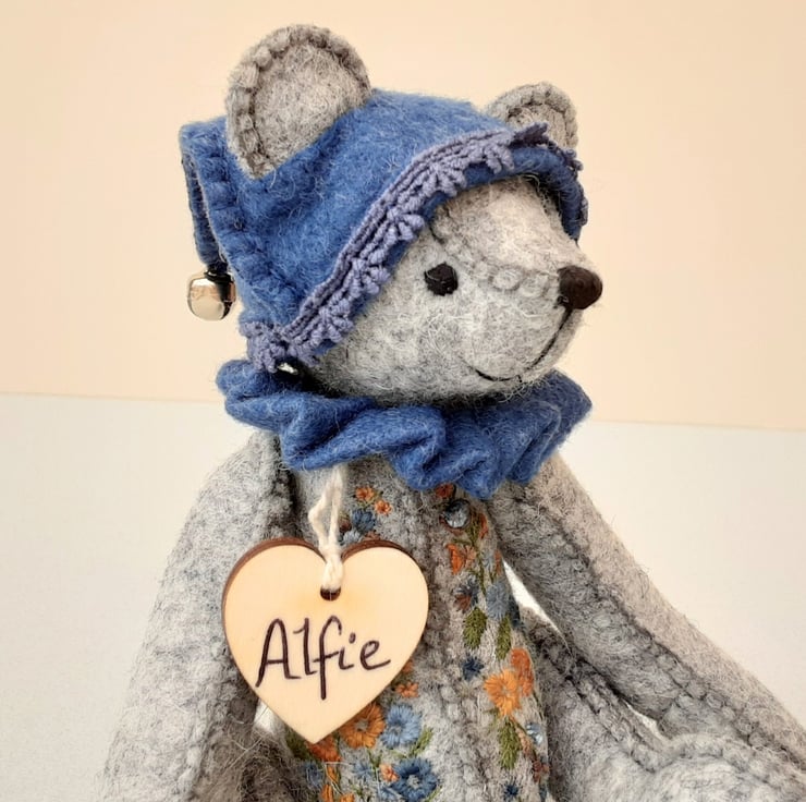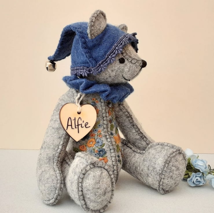 Alfie wears a lovely royal blue wool felt hat in an elf design finished with blue braid and a silver bell, he has a blue ruffle to match around his neck.