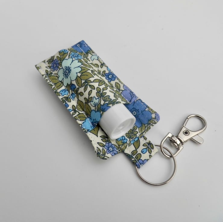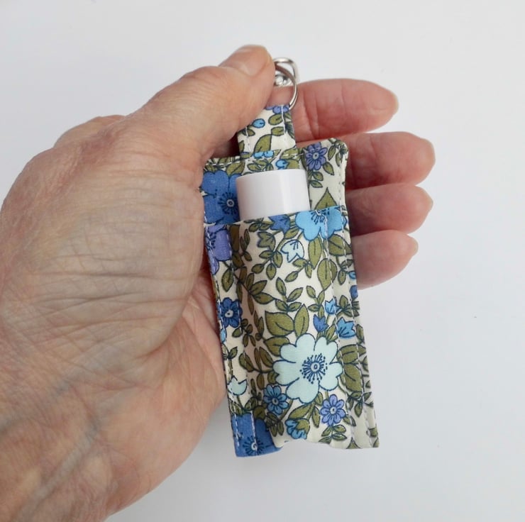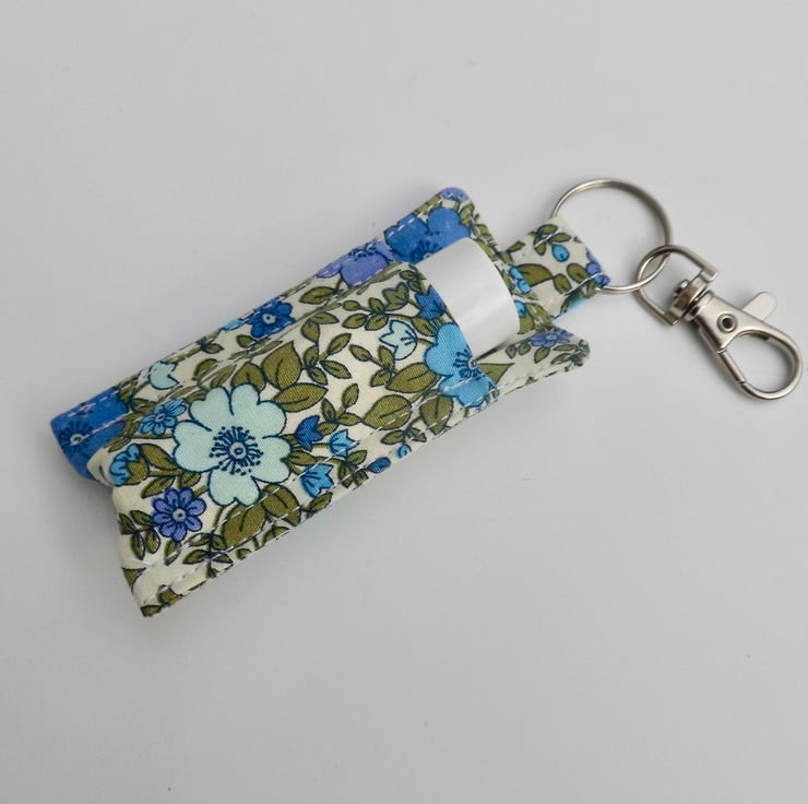 This is a little fabric pouch designed to keep your lip balm stick handily clipped to your bag, purse etc. For this one, I used a beautiful blue floral cotton print by Rose and Hubble.