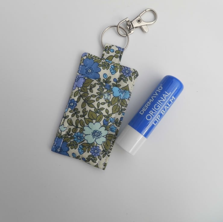 Interlined with fusible interfacing for extra body and top stitched with ivory thread. The main part measures approximately 4cm x 8.5cm. It has a silver tone split ring and lobster clasp so that it is ready to clip to wherever you need it, and the lip balm as shown is also included so it's good to go.