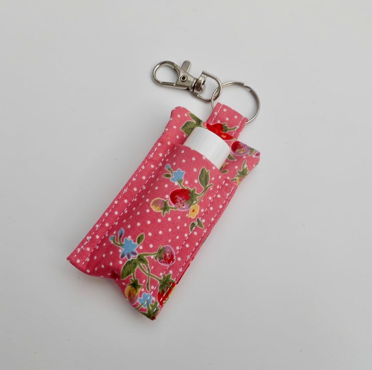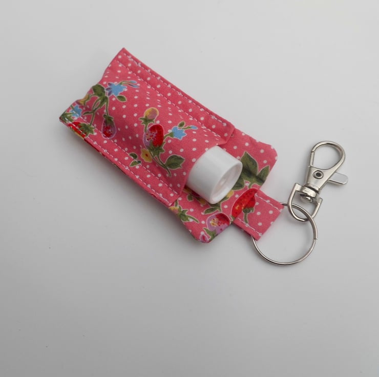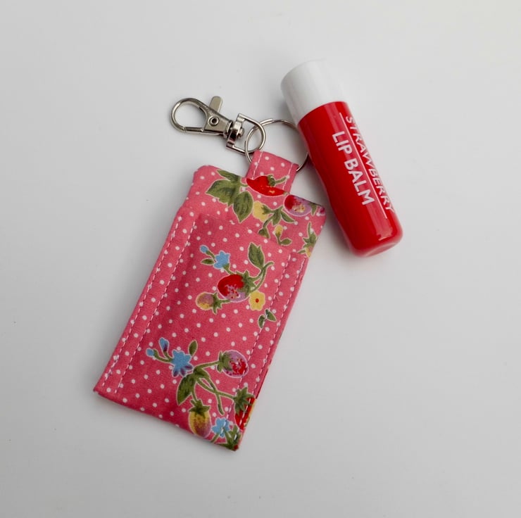 Interlined with fusible interfacing for extra body and top stitched with ivory thread. The main part measures approximately 4cm x 8.5cm. It has a silver tone split ring and lobster clasp so that it is ready to clip to wherever you need it, and the strawberry lip balm is included so it's good to go.