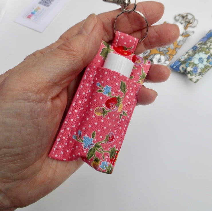 This is a little fabric pouch designed to keep your lip balm stick handily clipped to your bag, purse etc. For this one, I used a pink print of little summer fruits and flowers.