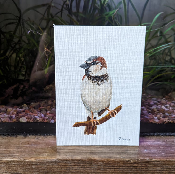 A 5" x 7" painting of a House Sparrow on a flat canvas board.