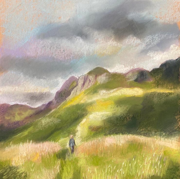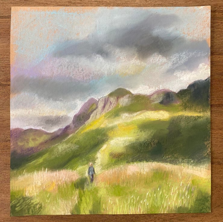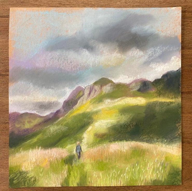 28cm by 29.5cm, I created 'Wandering in the Langdales' using mostly chalk pastels as well as coloured pencils. The Langdales is a stunning area of the Lake District, UK.