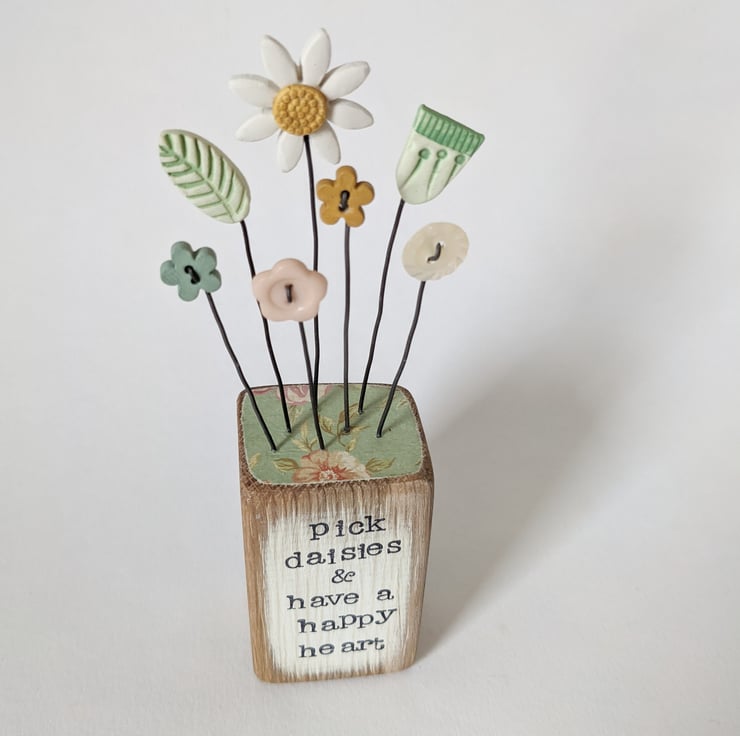 A pretty clay daisy flower stands on a wire stalk in a painted wooden block.