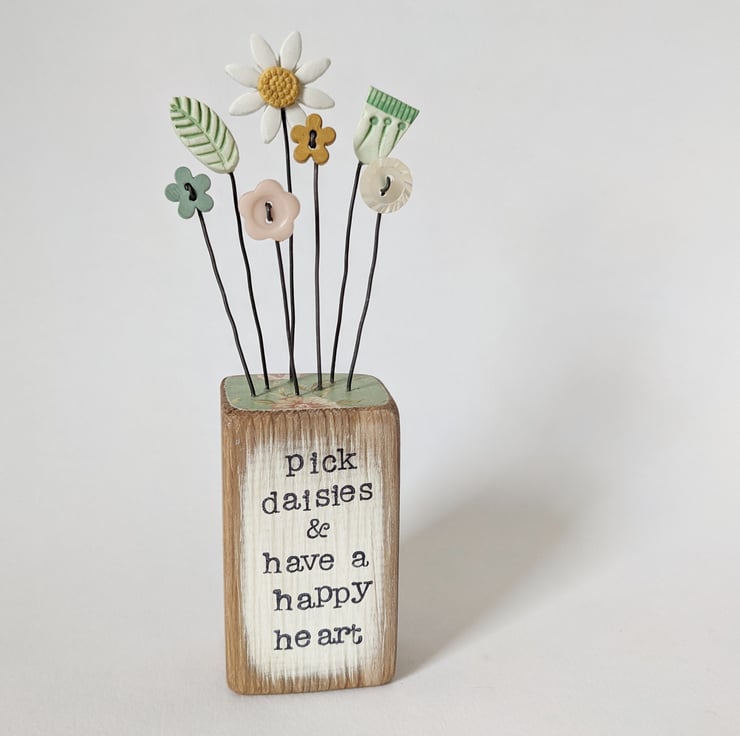 The hand stamped words on the front say 'Pick daisies & have a happy heart'.