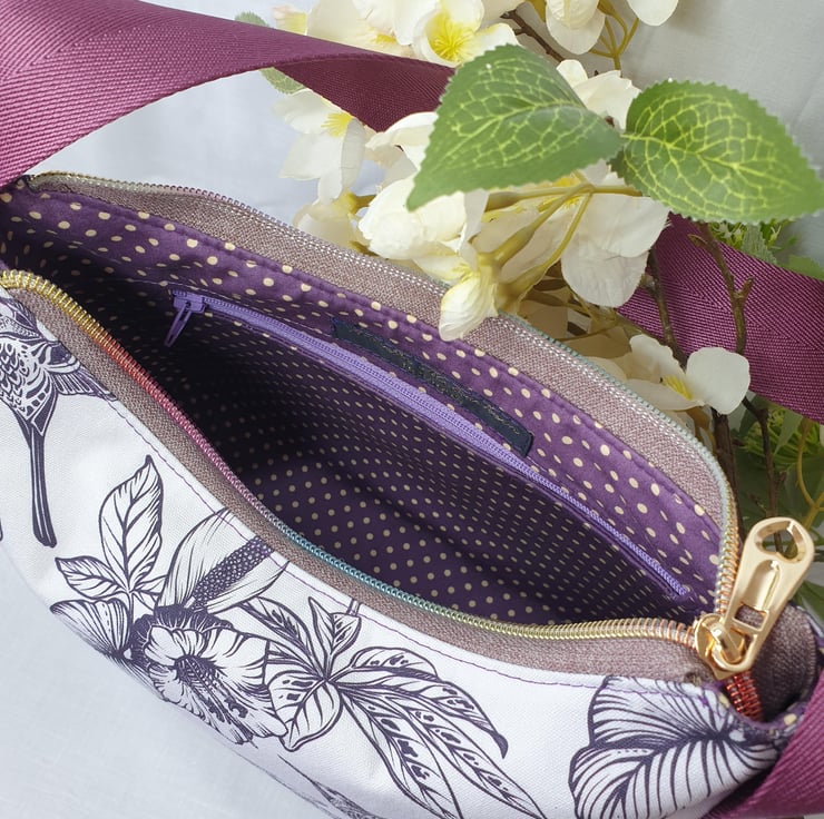 Interfaced with a soft, lightweight interfacing and lined in coordinating cotton with an interior zip pocket and finished with a webbing strap.