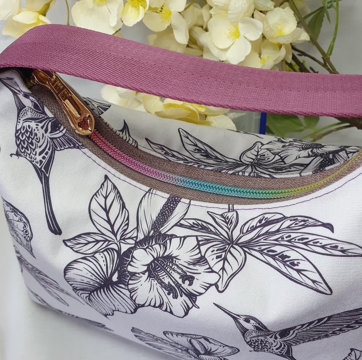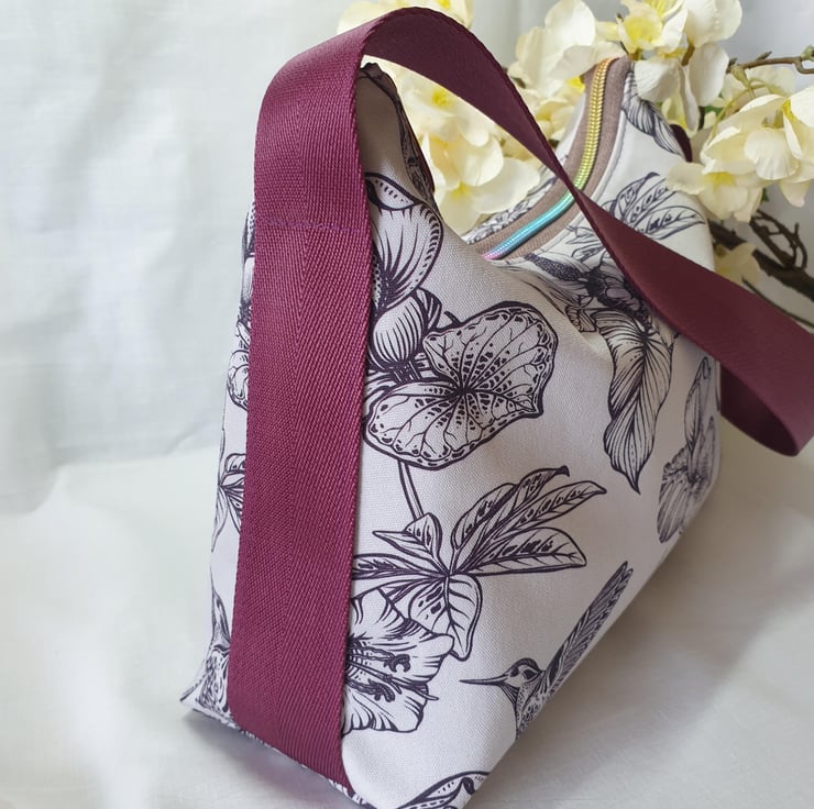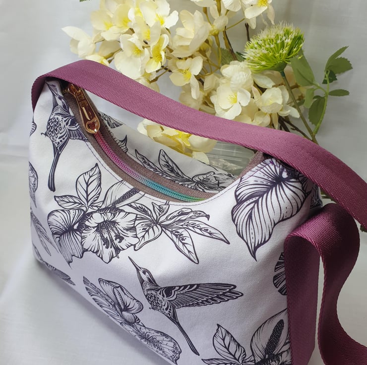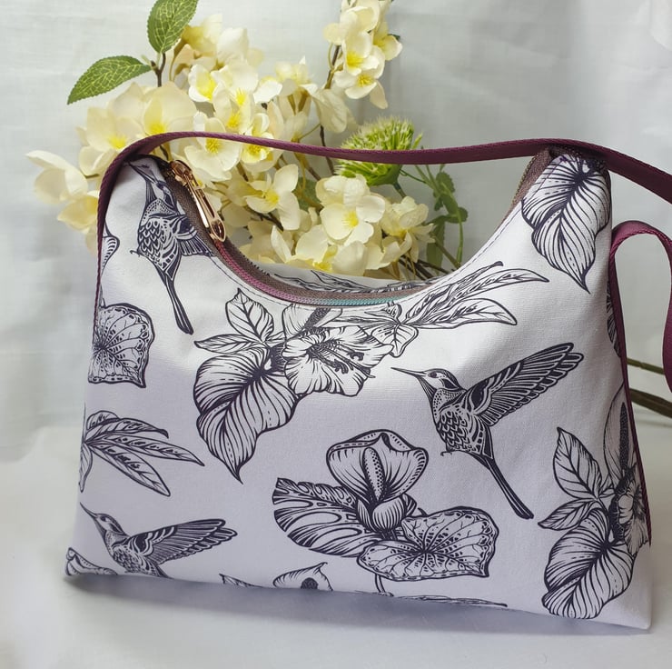 Water resistant cotton canvas baguette shoulder bag in a beautiful hummingbird design.