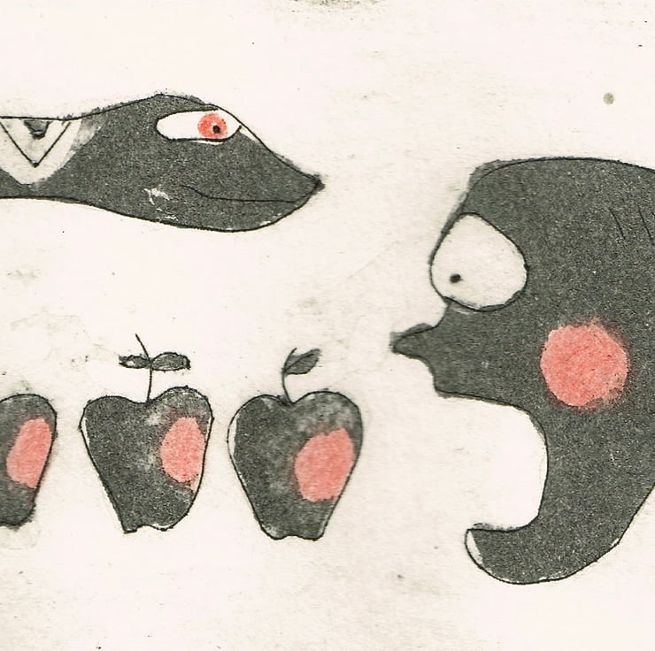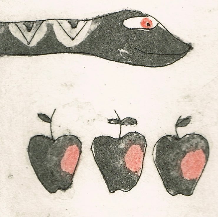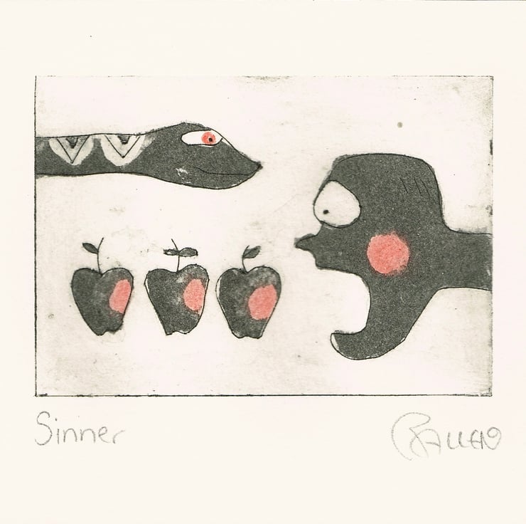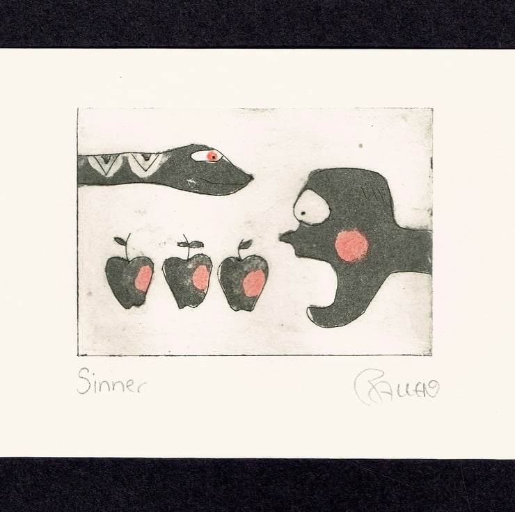 This is a hand coloured / hand printed dry point etching print, called ' Sinner ' . It is printed a slightly cream watercolour paper and I've signed and titled it in pencil. It is 14cm x 10.5 and the plate size is 9cm x 6cm.