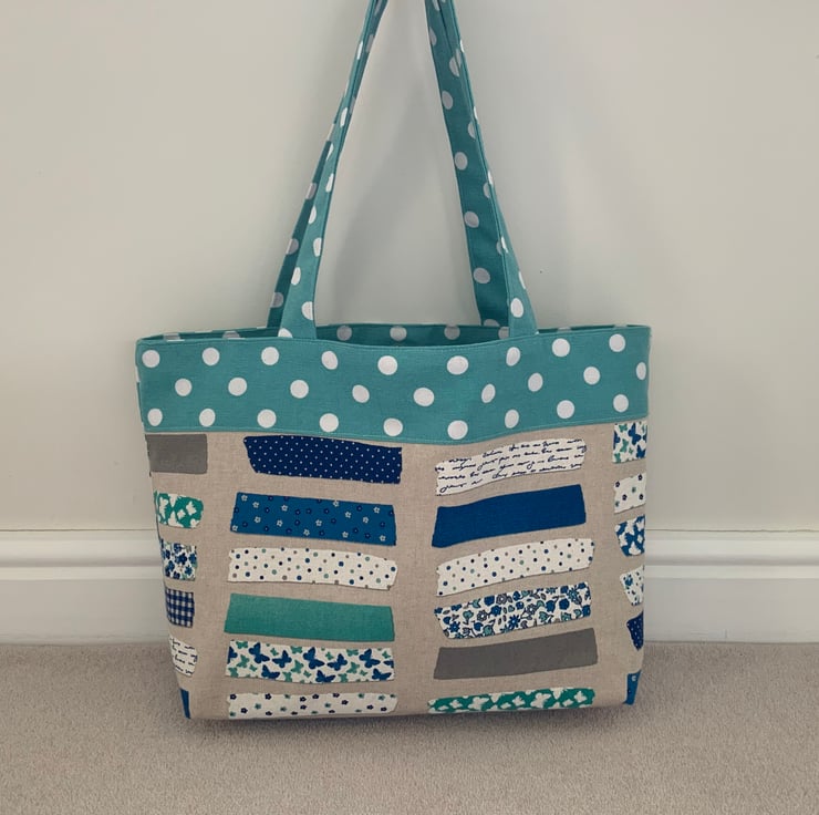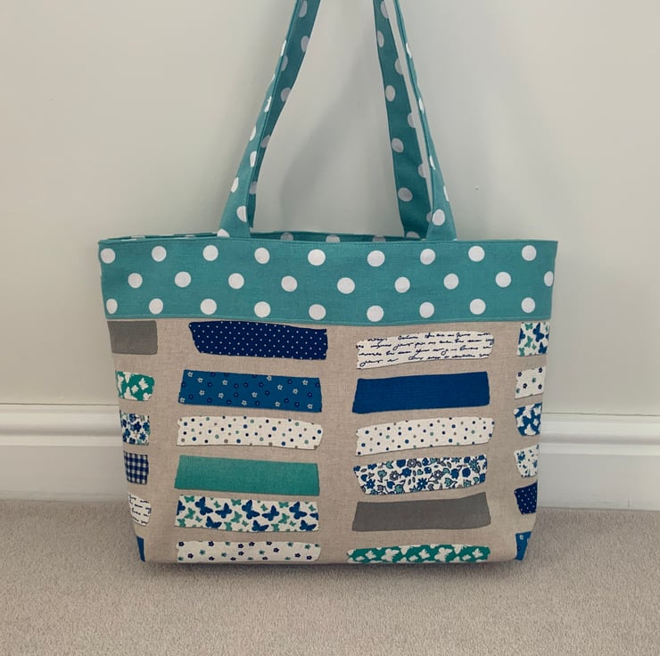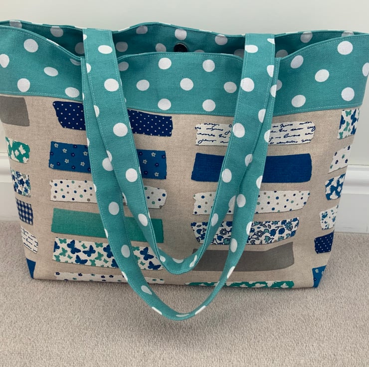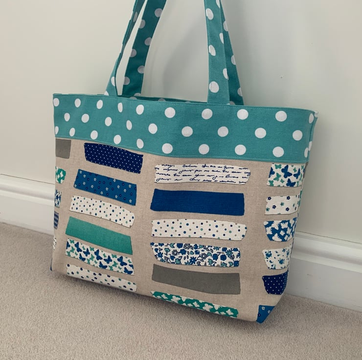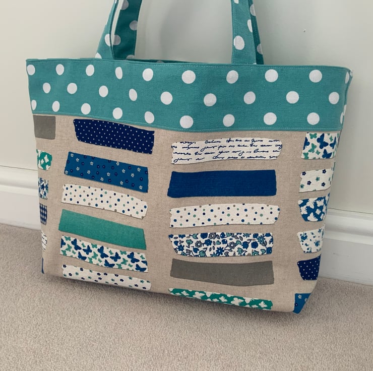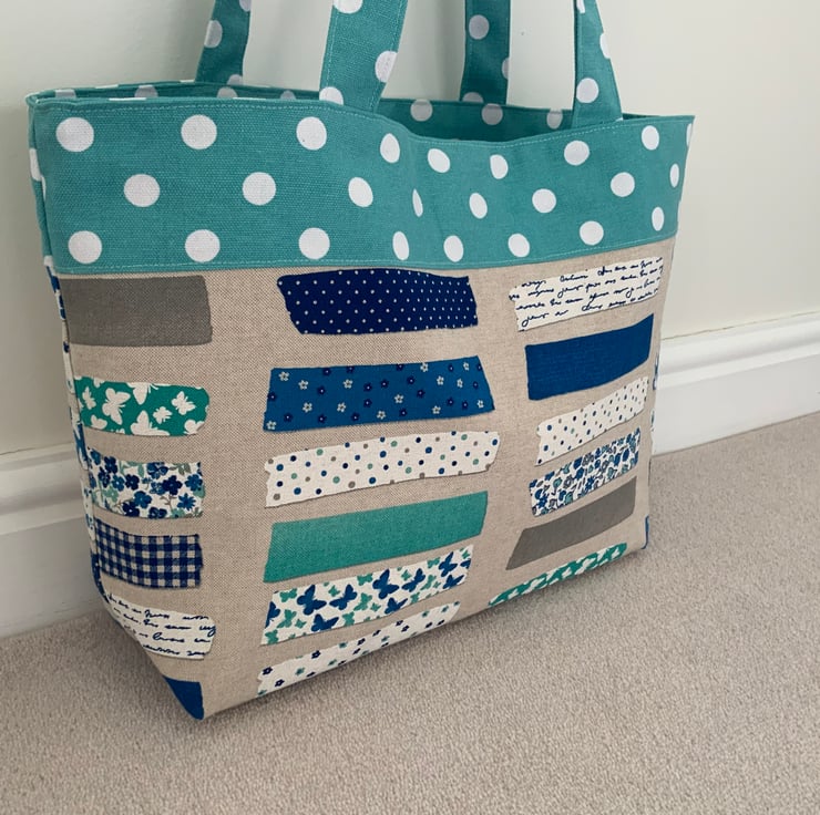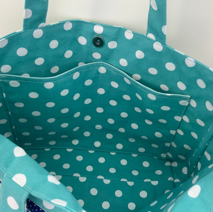 Beautiful handmade fabric tote bag. A perfect bag for day to day use, ideal for work, school, gym, shopping etc. Made from quality cotton and interfaced to give it structure. Internally, it has a large slip pocket divided into two sections and is fitted with a magnetic snap closure. The square bottom gives the bag extra depth.