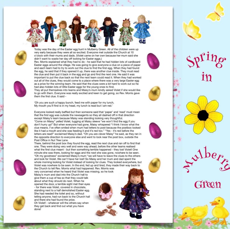 There are other children in Maisy’s class at school - Violet, Billy with his pet rabbit, Amber, Tilly, Rosie and her kittens, Amelia, Ruby, Marigold, Bobby with Max the dog, and the twins Oliver and Olivia, who have a puppy called Oscar. The dolls are all 26cm tall and baby Daisy is 16cm. Maisy and Mo love nothing more than having adventures with their friends. You can read about their adventures on my Facebook and Instagram pages - Maisy Muffin Rag Dolls and on my Mulberry Green Pinterest boards.