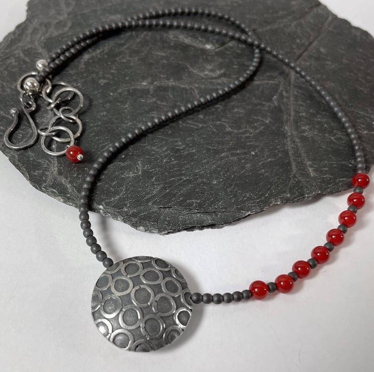 A handmade oxidised silver bead pendant is strung on small matte hematite beads, and has larger carnelian beads off to one side.
