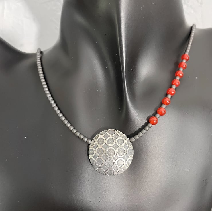 The hand made rondelle bead pendant has rows of silver rings fused to the front, it has been oxidised dark in the recesses.