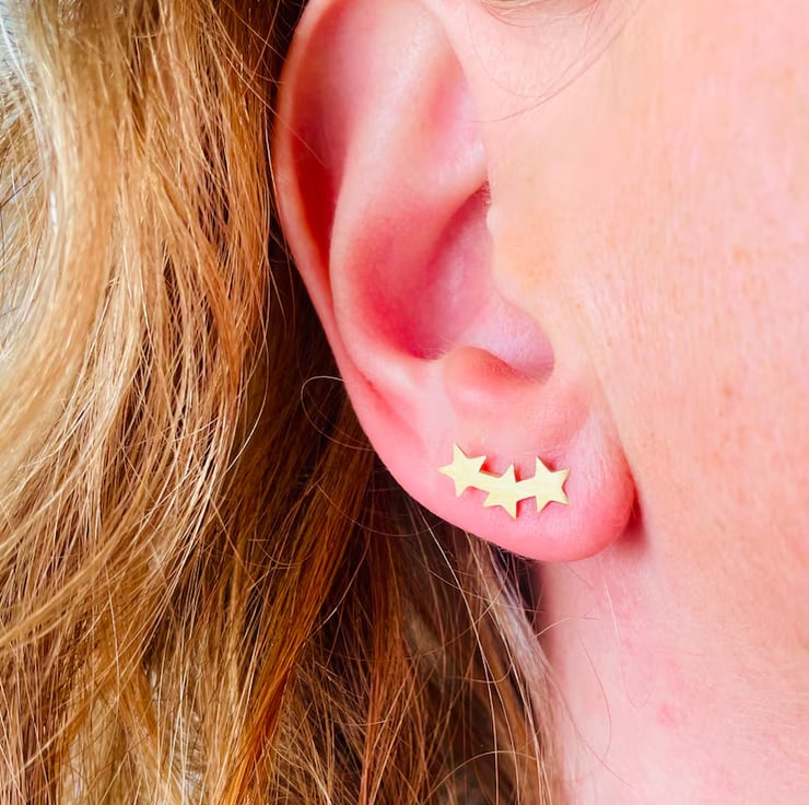 Very pretty, gold plated brass stud single earring, creeper style, 12mm in length, pushbacks. Starburst studs. Free gift pouch.
