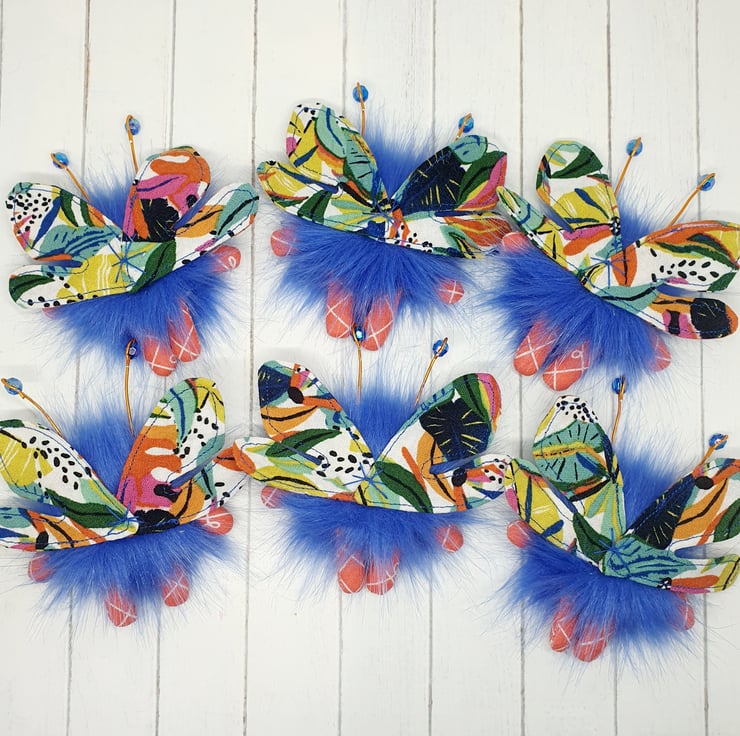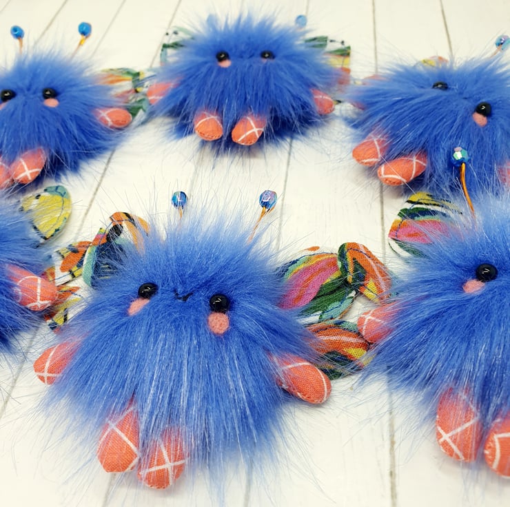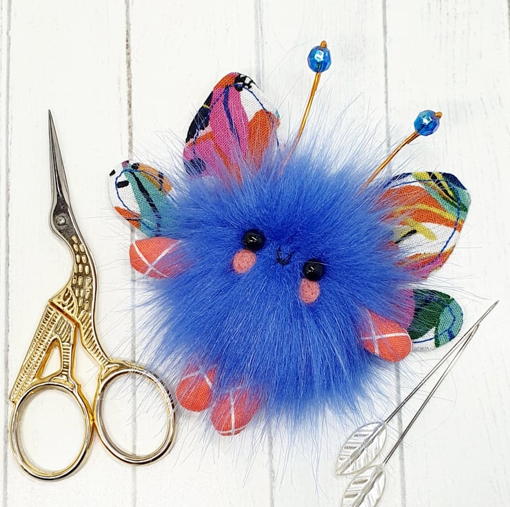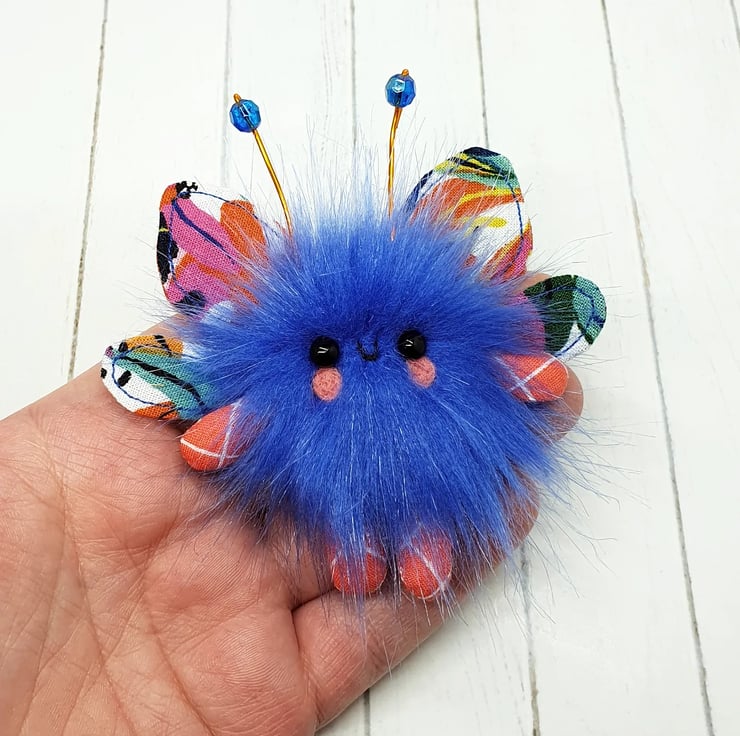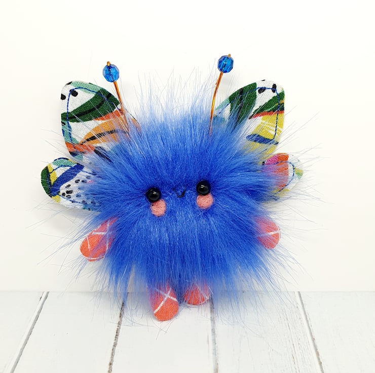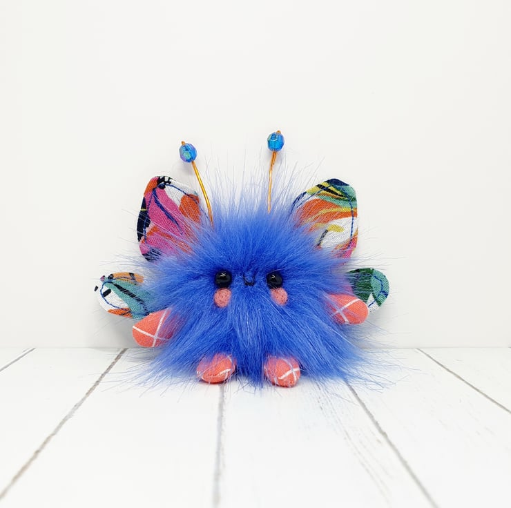 Cute little floof made from extra soft faux fur. These floofs are hand sewn with bright floral print wings and sparkly bead topped antenna. This floof has stubby little arms and legs, glass bead eyes and needlefelted cheeks. Their smiles are hand sewn and they come with transparent loop hangers. Your floof will be chosen at random from those pictured above. This listing is for one floof only. Floofs measure roughly 9.5cm tall with a 8cm wingspan. These are delicate and for decorative purposes only, not a toy.