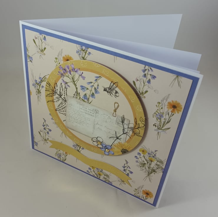 Square, floral birthday card. The card features a circular blue and yellow topper with the foiled sentiment Birthday Greetings' below. Adhesive gems have been added to the centres of two of the flowers on the topper. The topper and sentiment have been overlaid onto matching background paper.