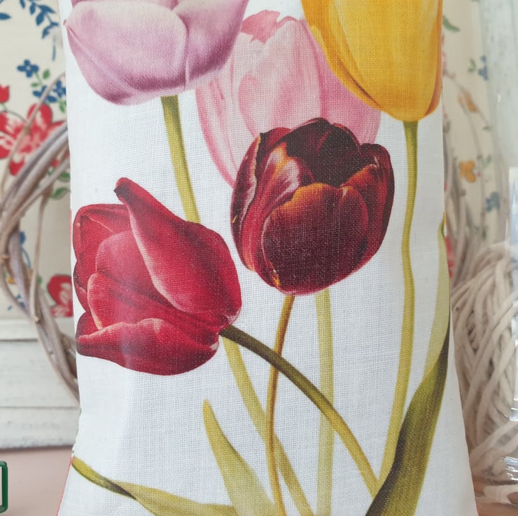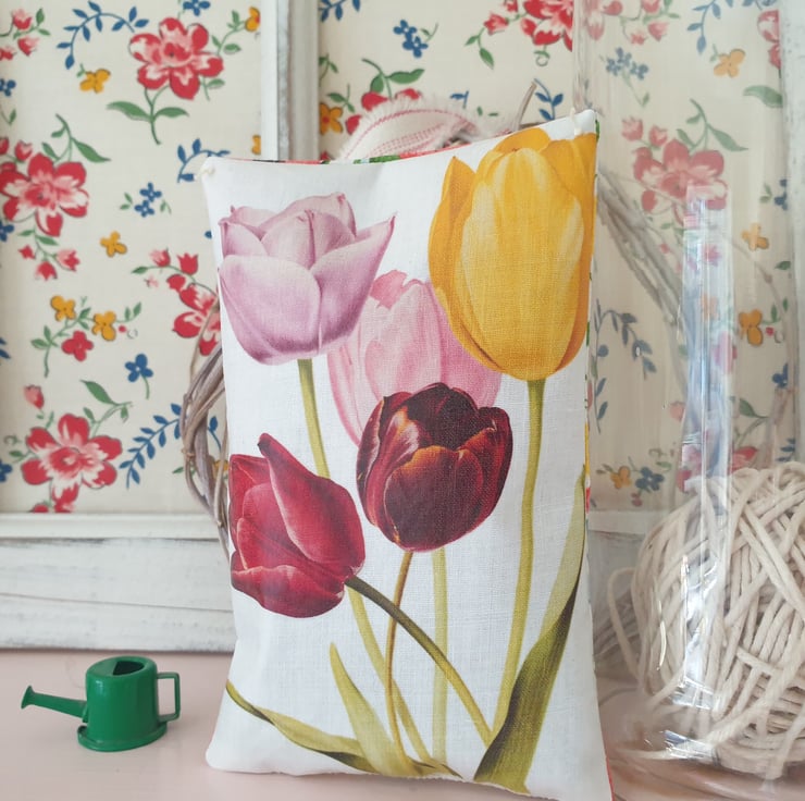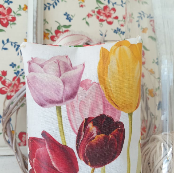 This lovely tulip flower illustration has been made into a scented gift pillow. I've hand printed the illustration onto fabric and each one can be scented with lavender or rose petals. The pillow comes ready to hang with string and measures 9 x 13.5cm.