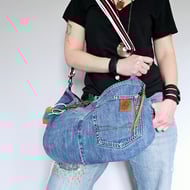 Add a pop of personality to your everyday outfit with this uniquely handcrafted denim upcycled crossbody bag.