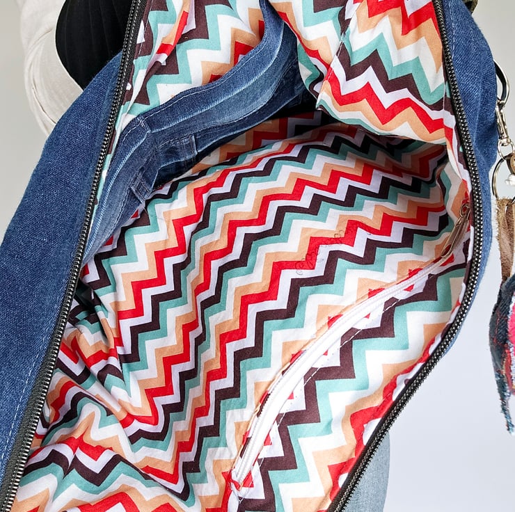 Made from repurposed denim jeans, this slouchy bag features a double zipper for easy access to your essentials.