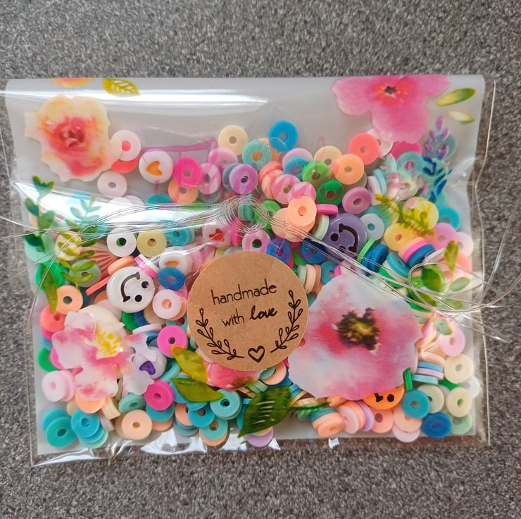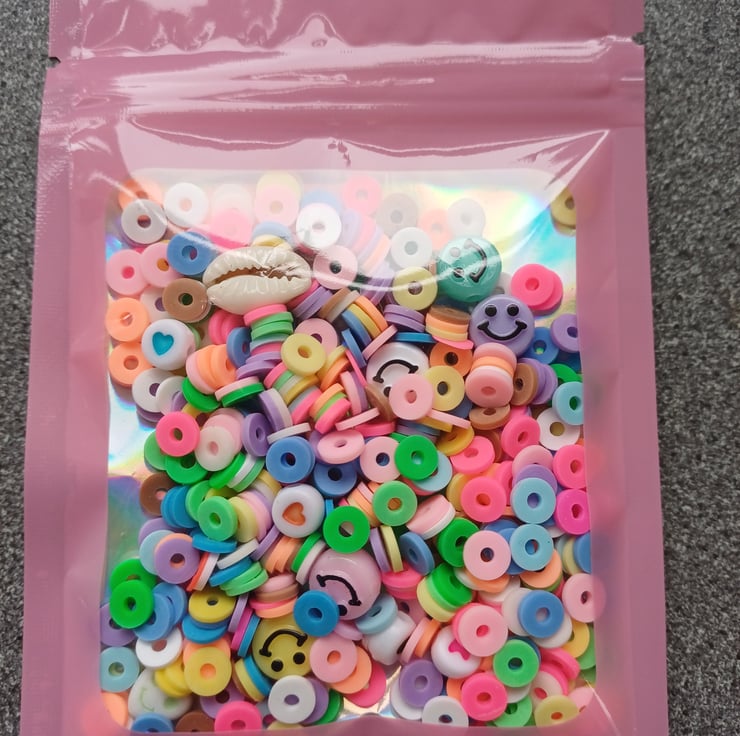 Selection of colourful clay beads and other beads for making your own bracelets. Comes with string and in a small jewellery bag. Ideal little gift and great for children or anybody who likes making bracelets.