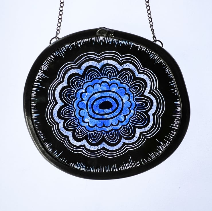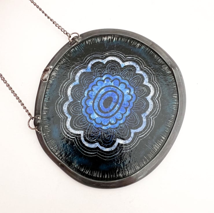 Blue hanging traditional stained glass and leaded decoration, featuring a hand painted sgraffito 1970s inspired flower. The paint has been fired into the glass so it is permanent and won’t fade. The decoration is edged with lead came and cemented in, so it is very robust. This looks beautiful when hung in a window and is a lovely postable gift idea.
