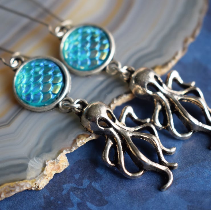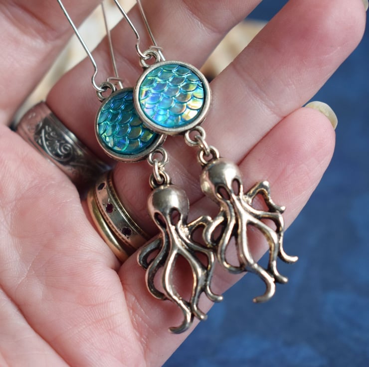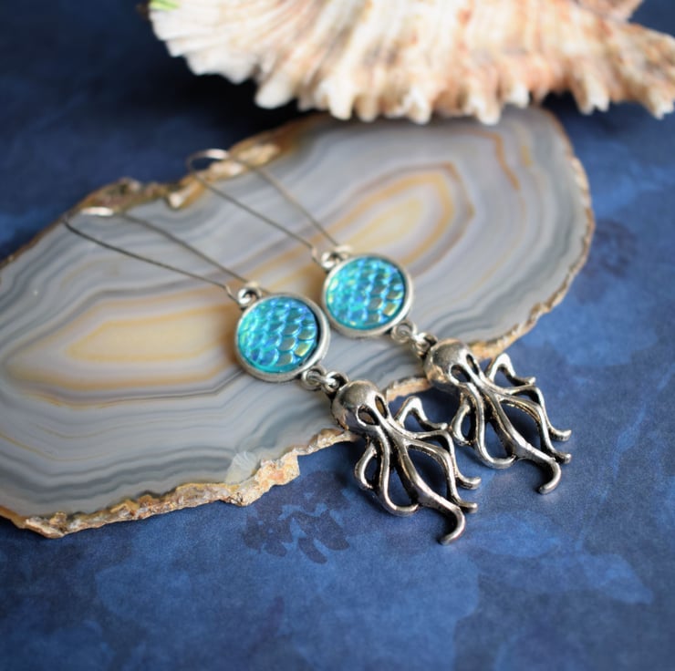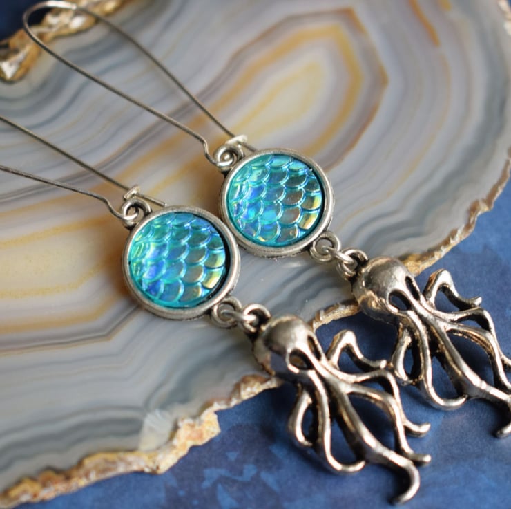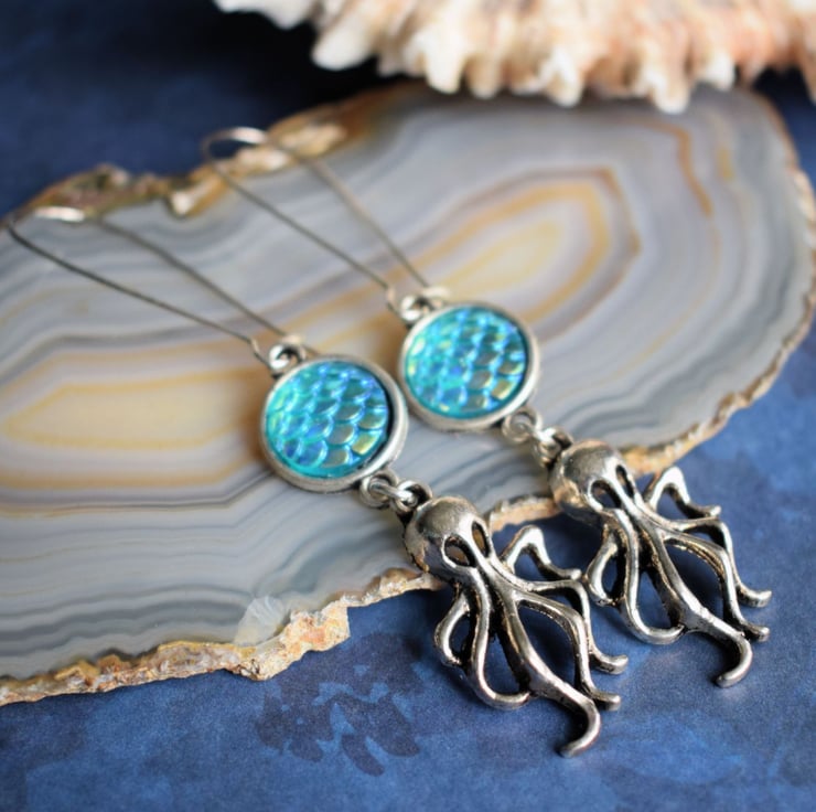 I've used Tibetan silver octopus pendants for these earrings and paired them with some iridescent mermaid scale cabochon connectors in this gorgeous ocean blue. The earwires are long latchback style which I love using for the longer earrings as they feel secure but still give the dangle section a lovely swing! These are silverplated.