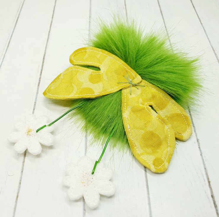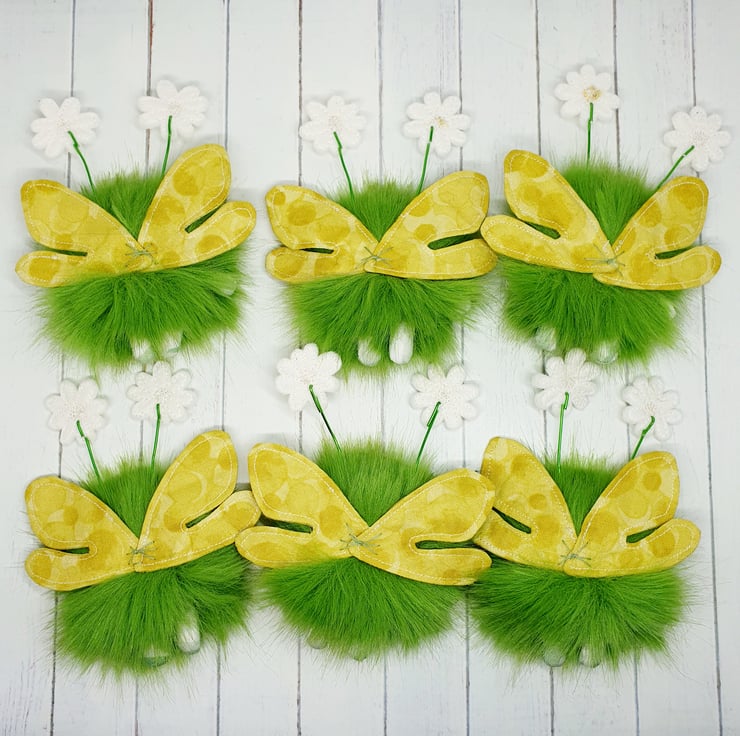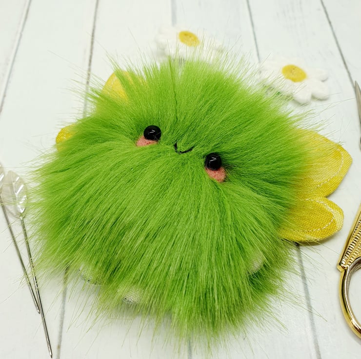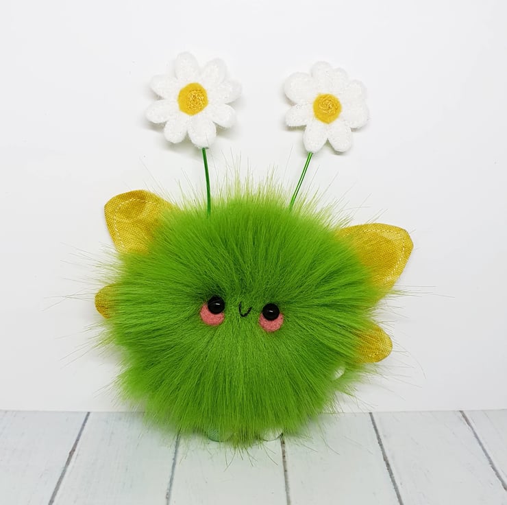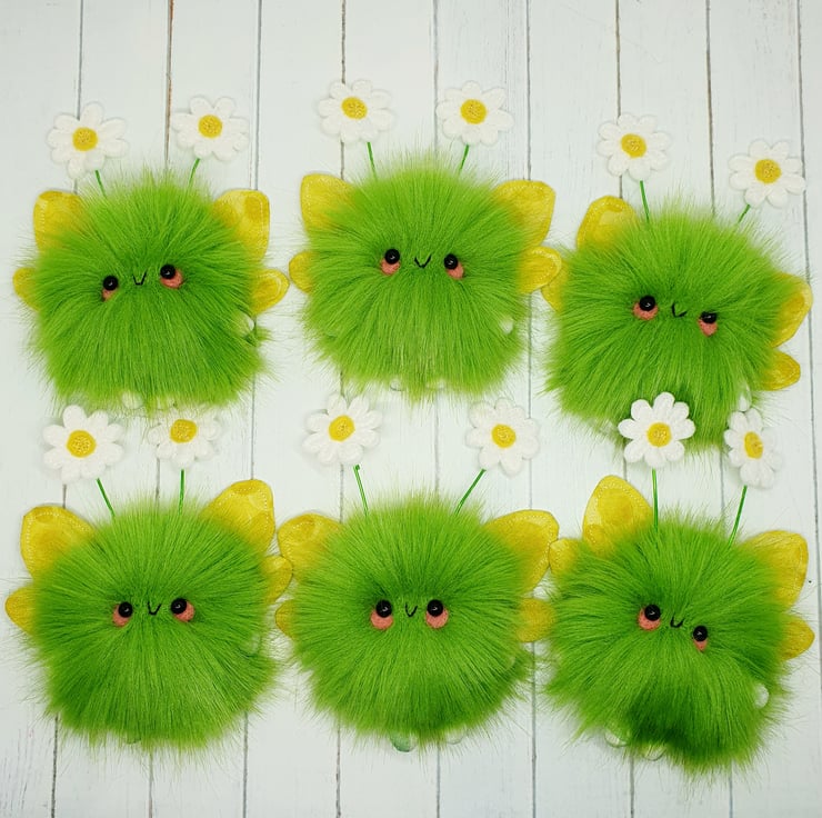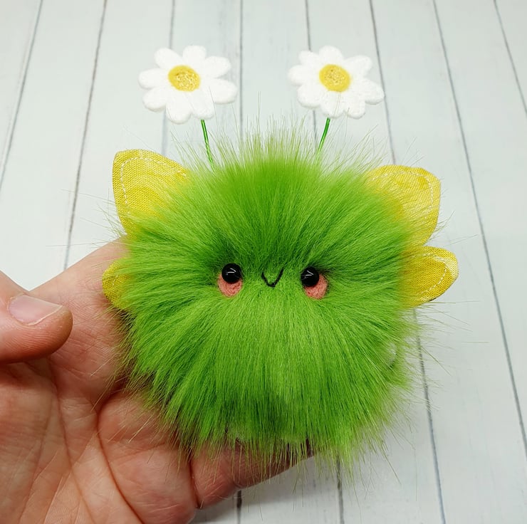 Cute little floof made from extra soft and thick faux fur. These floofs are hand sewn with pretty muti tonal yellow print wings and free motion embroidered felt daisy topped antenna. This floof has stubby little arms and legs, glass bead eyes and needlefelted cheeks. Their smiles are hand sewn and they come with transparent loop hangers. Your floof will be chosen at random from those pictured above. This listing is for one floof only. Floofs measure roughly 12cm tall with a 9cm wingspan. These are delicate and for decorative purposes only, not a toy.