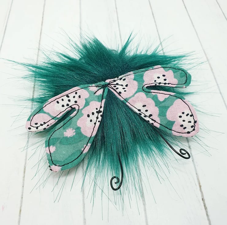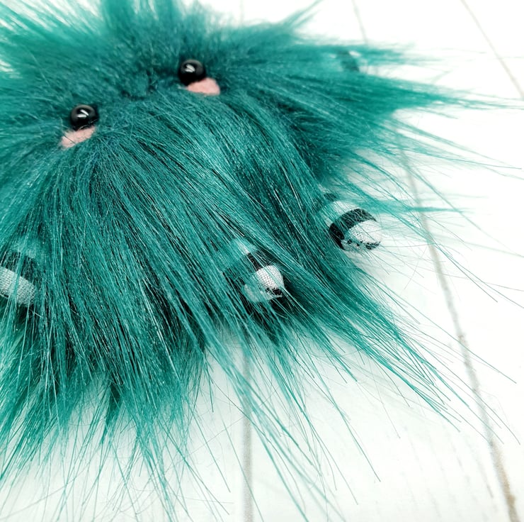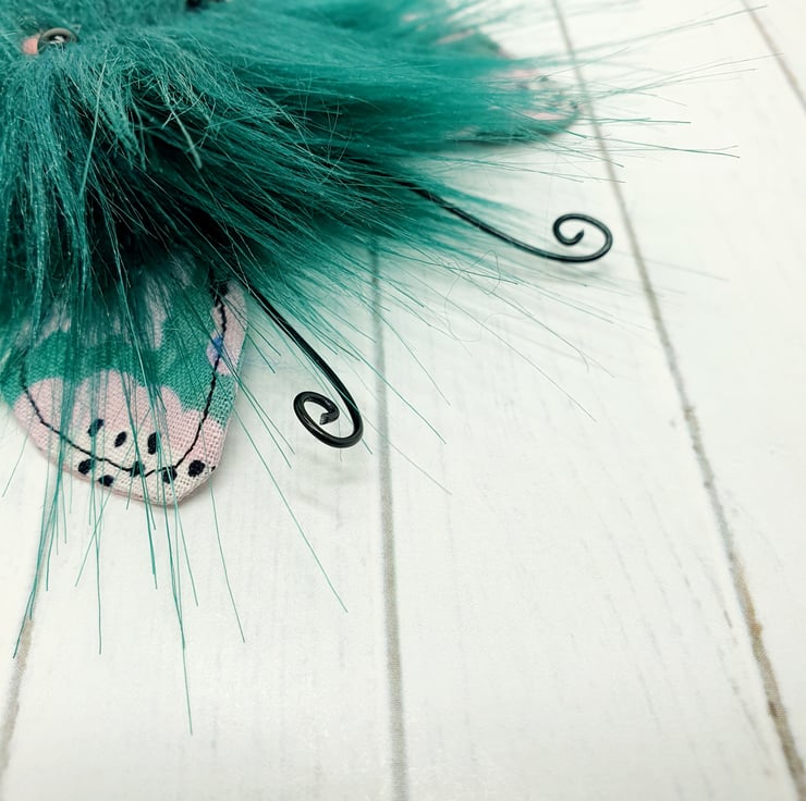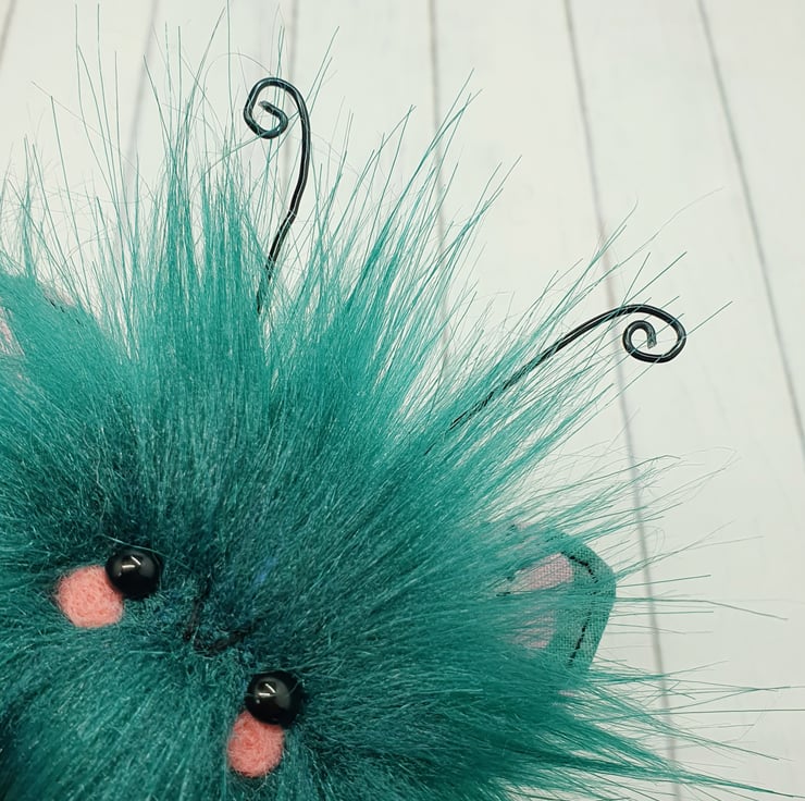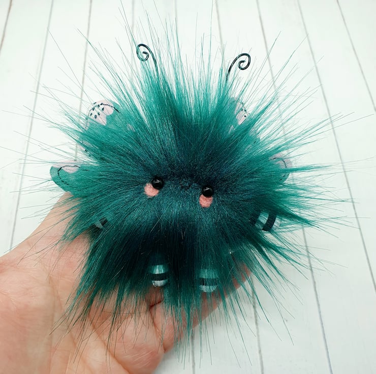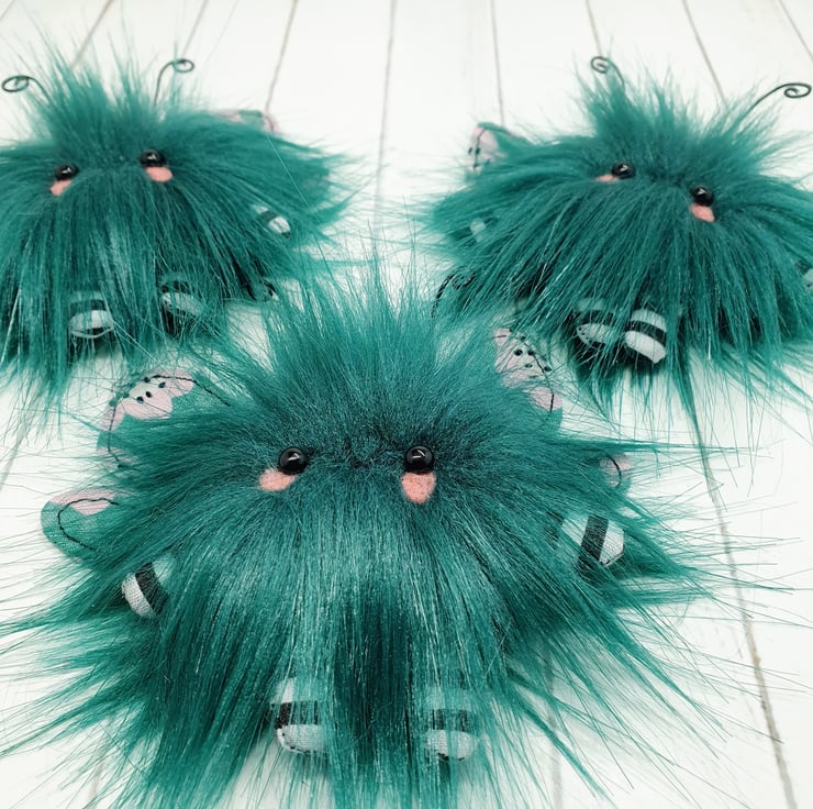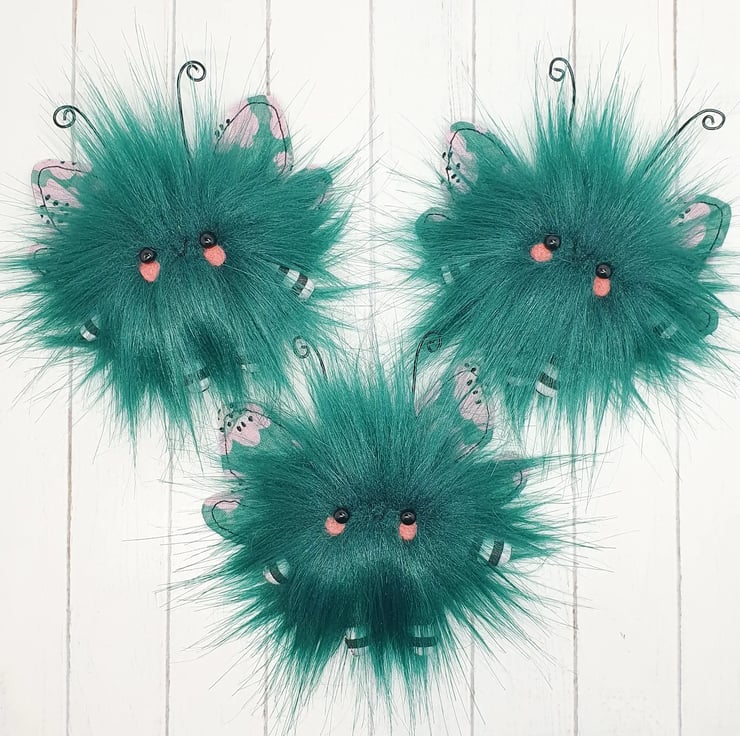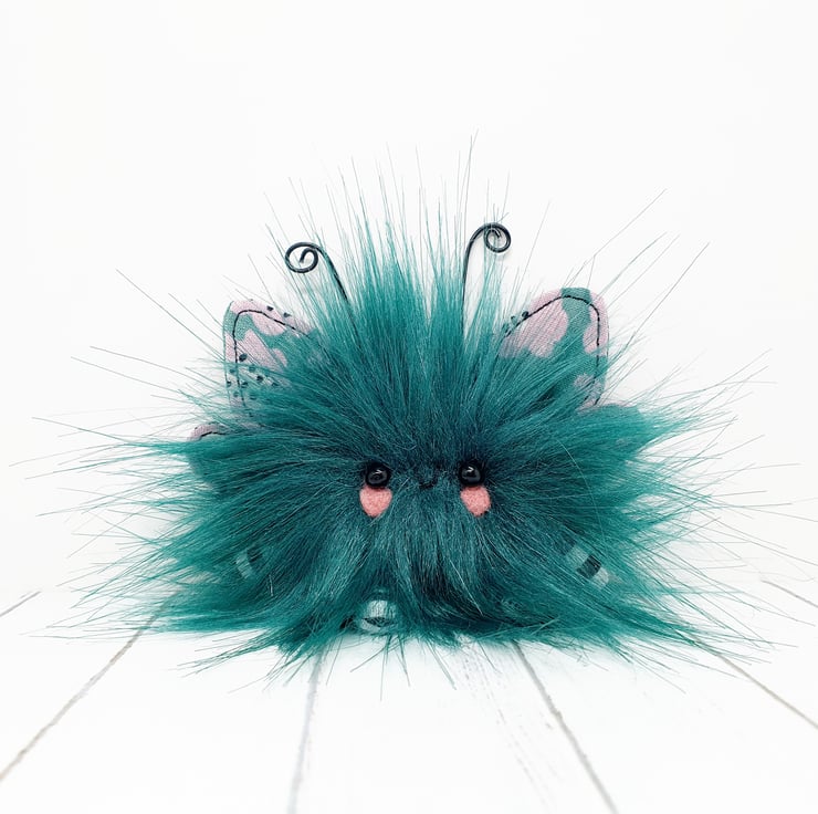 Cute little floof made from extra soft and thick faux fur. These floofs are hand sewn with monochrome and pink floral print wings and curly coloured wire antenna. This floof has stubby little arms and legs, glass bead eyes and needlefelted cheeks. Their smiles are hand sewn and they come with transparent loop hangers. Your floof will be chosen at random from those pictured above. This listing is for one floof only. Floofs measure roughly 10cm tall with a 10cm wingspan. These are delicate and for decorative purposes only, not a toy.