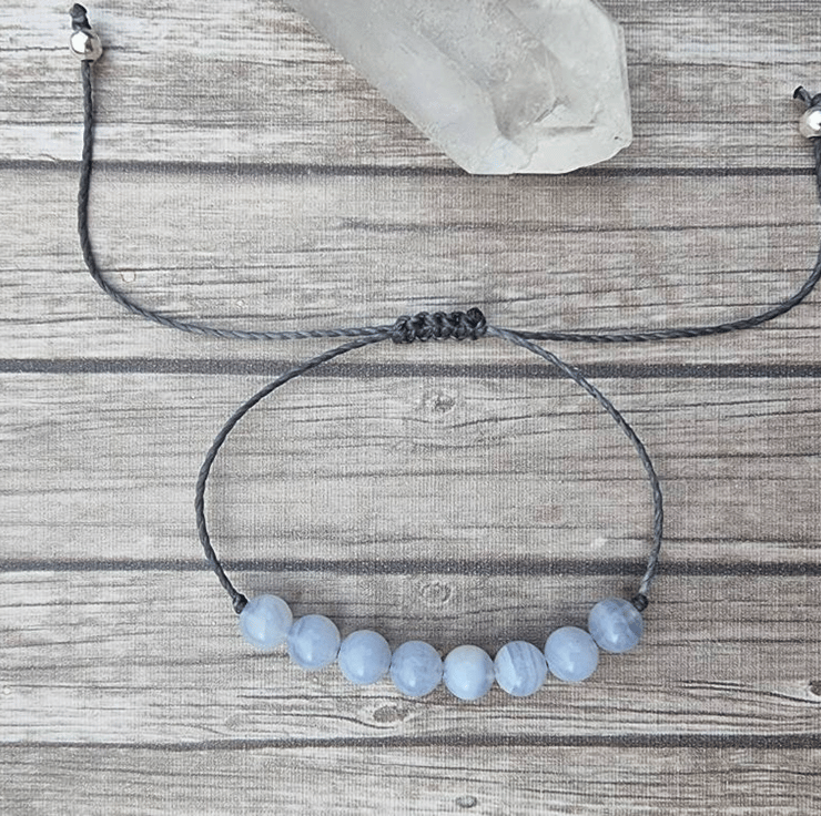waxed Brazilian cord - Blue Lace Agate round beads 6mm - Clear Quartz beads (4mm) - sliding knot closure