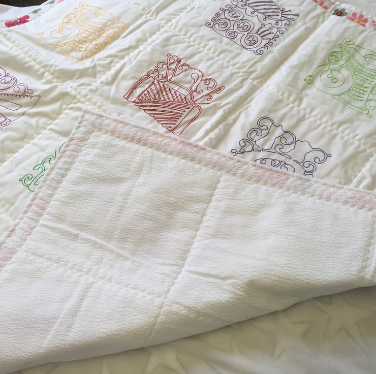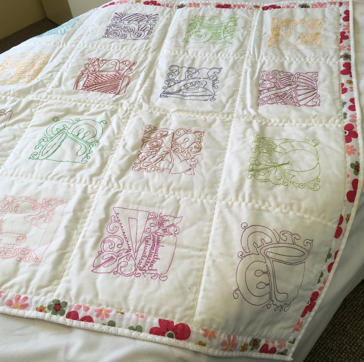 This summery looking quilted cloth could be used in several ways. As a table topper in a conservatory, a sewing room or craft room as well as a lap quilt. It’s decorated with Single Line embroideries of sewing items such as, an iron, thimble, pincushion, buttons, sewing machine and is in delicate pastel colours on a white background.