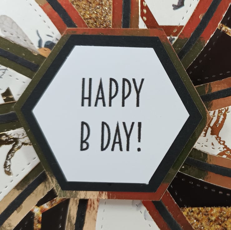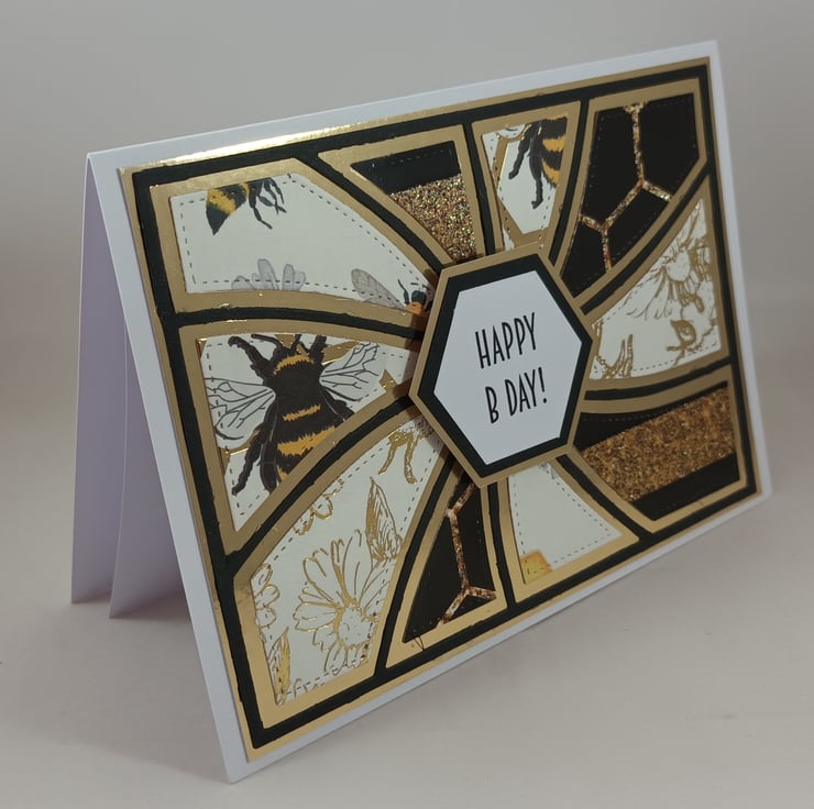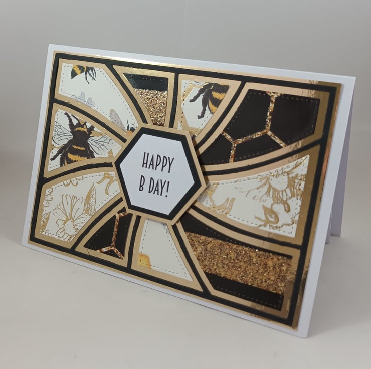 A6, landscape birthday card, featuring a background created from bee themed papers in a die cut sunburst pattern. The sentiment in the centre of the card reads: 'Happy B Day!' and is mounted on hexagons of gold and black card.