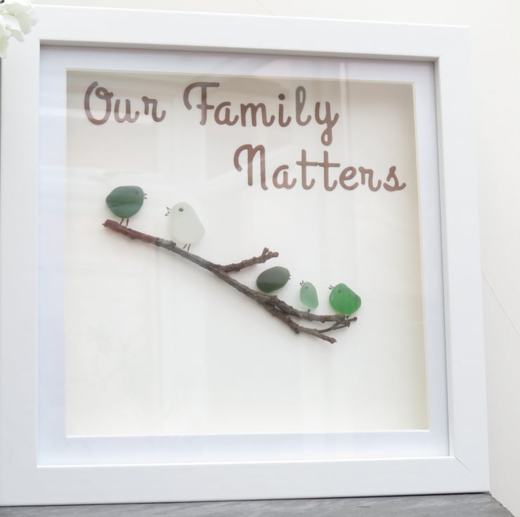 Sea Glass Family of Five Birds Box Frame Picture with Our Family Natters Wording