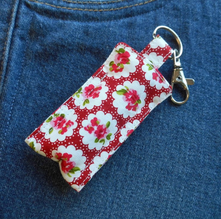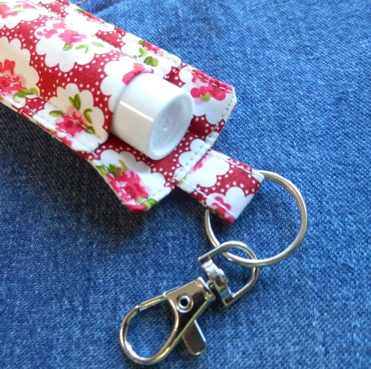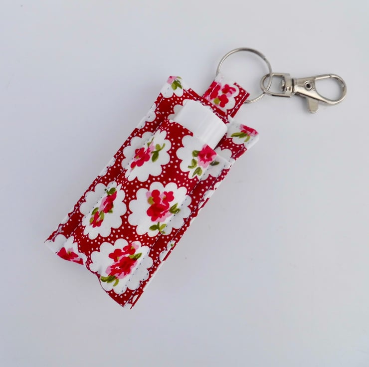 This is a little fabric pouch designed to keep your lip balm stick handily clipped to your bag, purse etc. For this one, I used a cotton print in red with pink flowers.