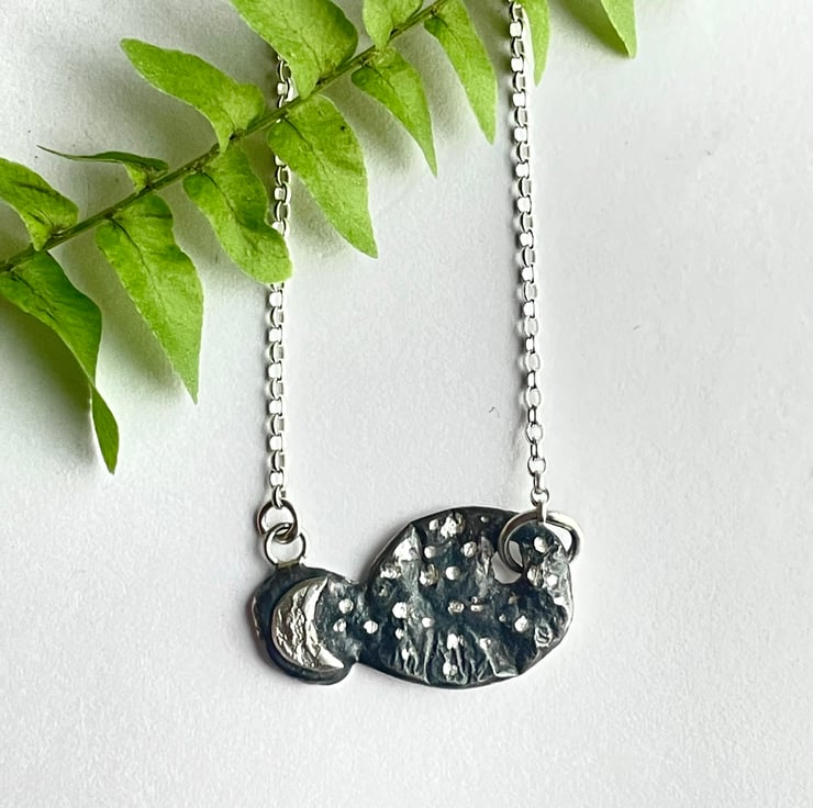 Perfect for the star gazer in your life this little necklace has been handcrafted from recycled sterling silver. Its irregular textured shaped features a little crescent moon on one side and lots of little silver dots to represent the stars. The background is oxidised to a dark grey for contrast. This is hung from a sterling silver chain which is approx. 18 inches over all.