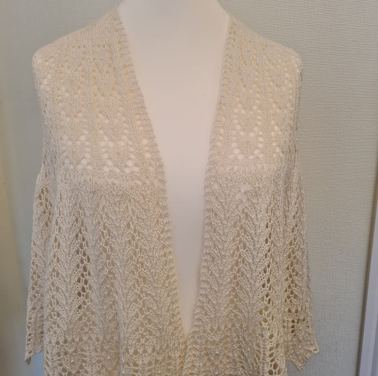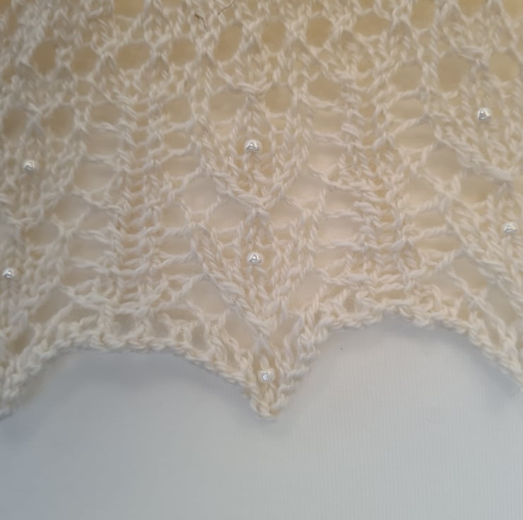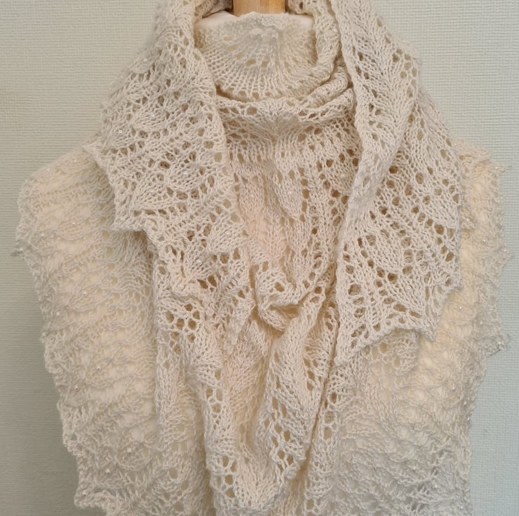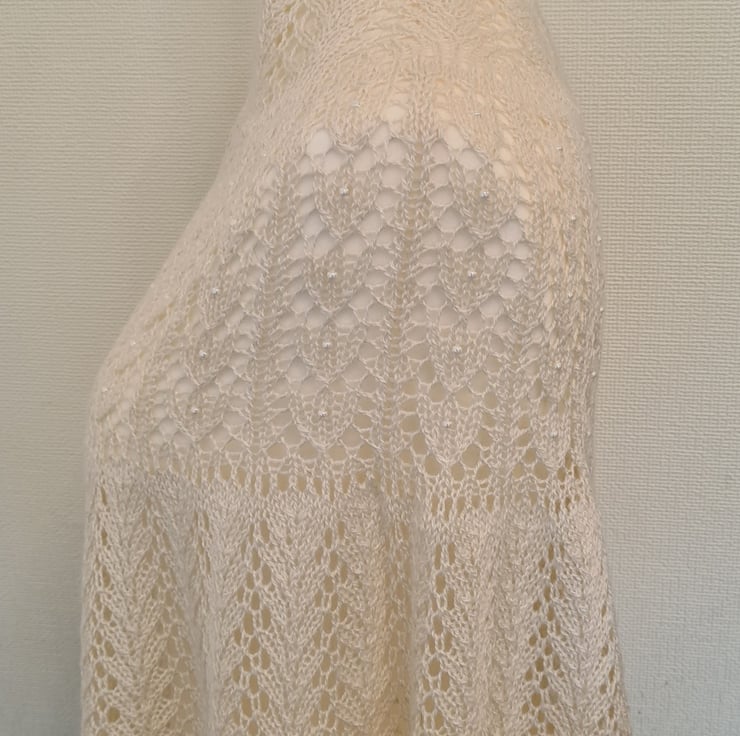 The heart motif is accentuated over the shoulders and repeated again along the bottom edge. Each heart has an Ivory Pearl bead produced by Miyuki, who are renowned as one of the best glass bead manufacturers in the world. I've added more of these beads along the edge points. All the beads are knitted into the shawl so they're very secure.