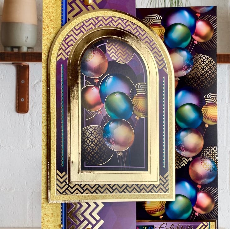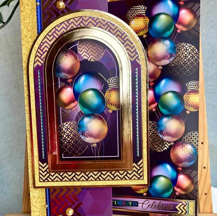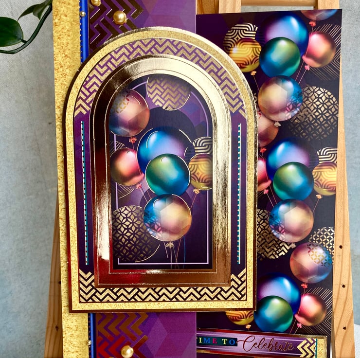 Measuring 15 x 18 cms this zig zag card features a cascade of metallic balloons on a vivid purple background. A large balloon topper with a gold surround has been added in 3D.