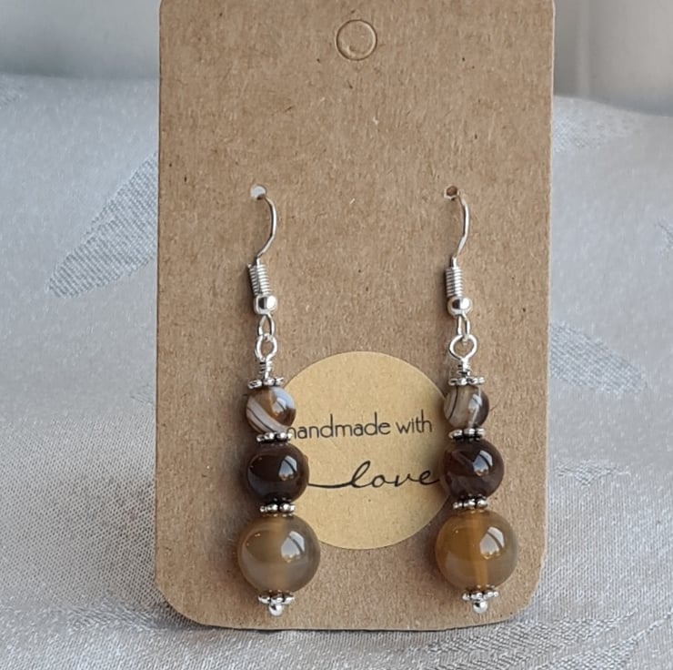 Gorgeous Coffee Lace Agate Earrings consisting of a trio of medium Brown (Cappuccino) tone stripey beads on Silver tone ear wires.