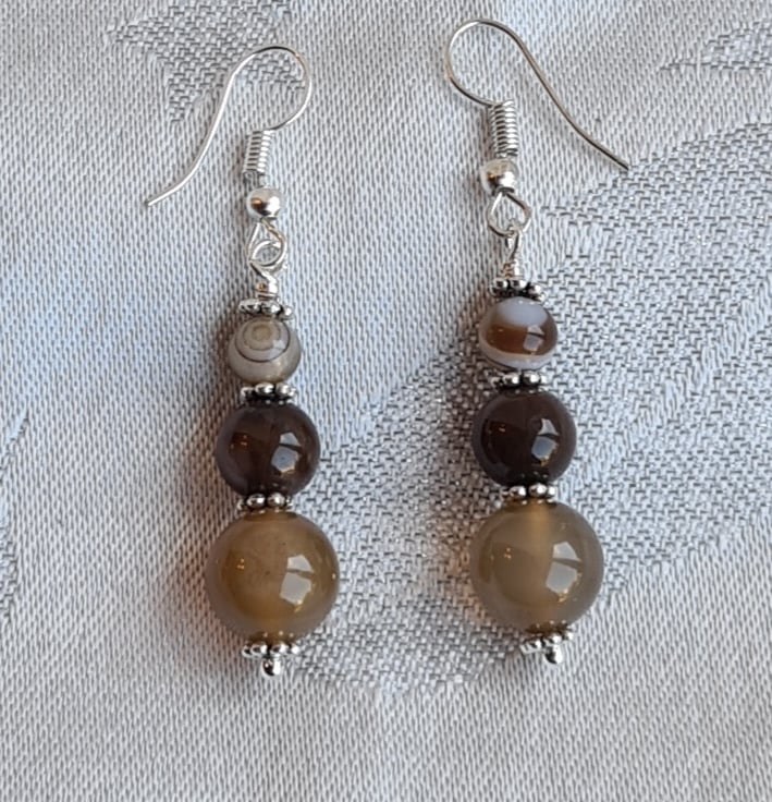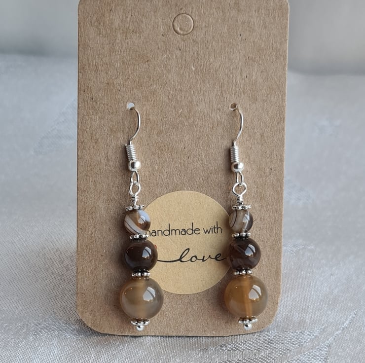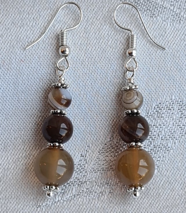 Gorgeous Coffee Lace Agate Earrings consisting of a trio of medium Brown (Cappuccino) tone stripey beads on Silver tone ear wires.