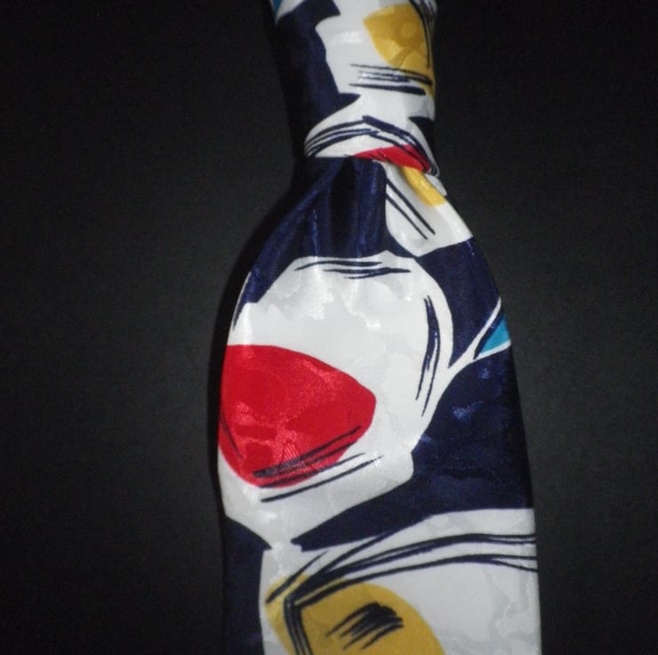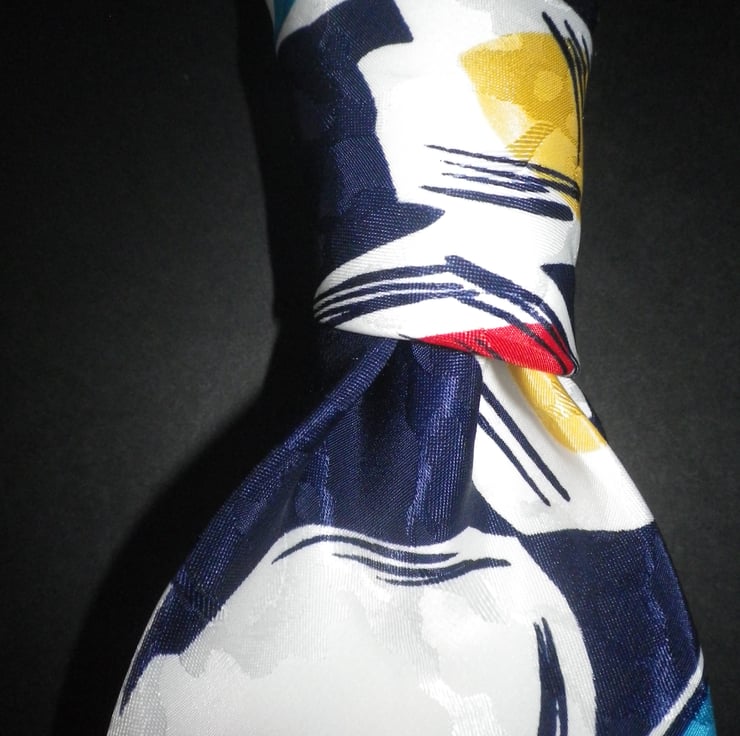 Strong coloured motifs on deep navy silk screen print tie, 9.5cm, free shipping