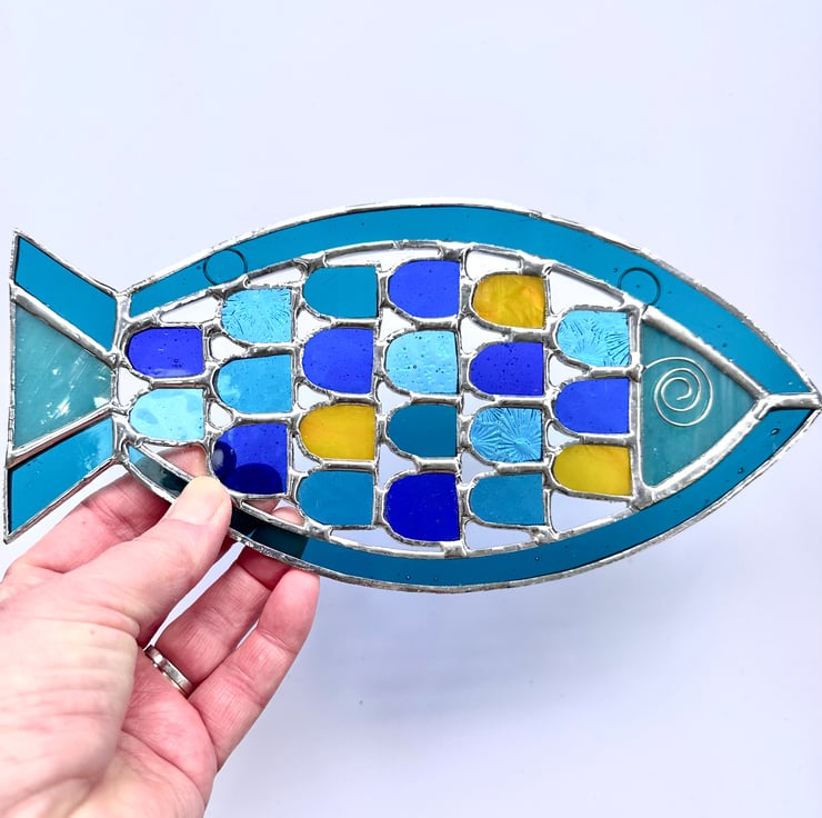 This suncatcher has been made using a mix of different types of textures and shades of turquoise / blue and iridised yellow stained glass so makes it truly interesting.