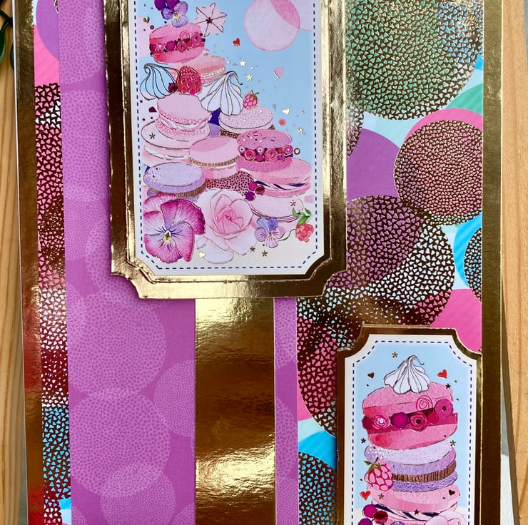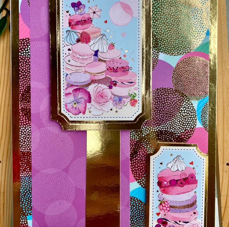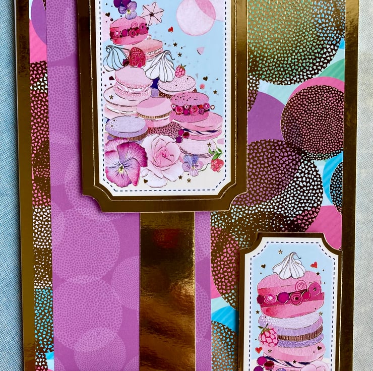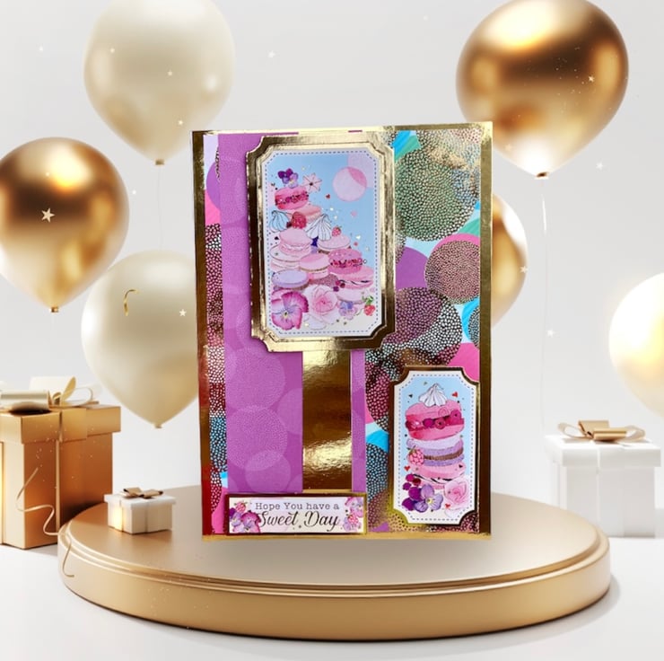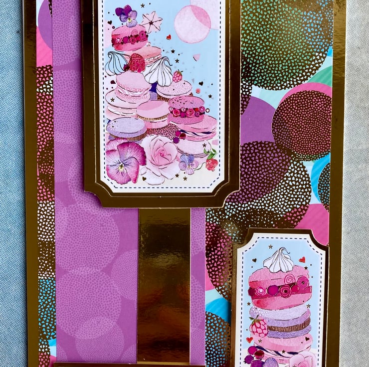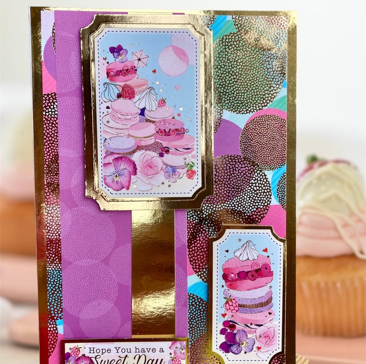 This beautiful card has a gold base layered with a vibrant spotty mirrored card. A purple banner has been added which has been overlaid with gold and a macaron ladened topper.