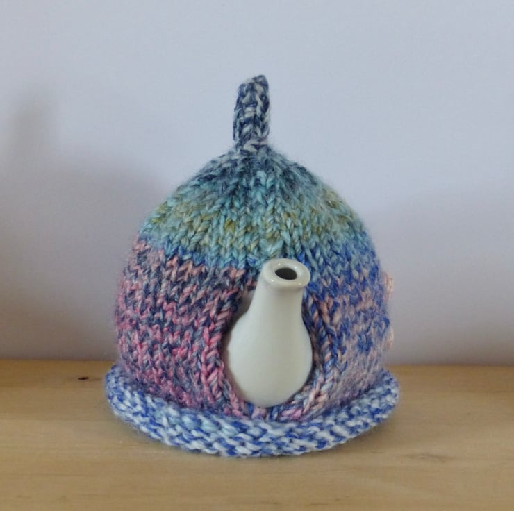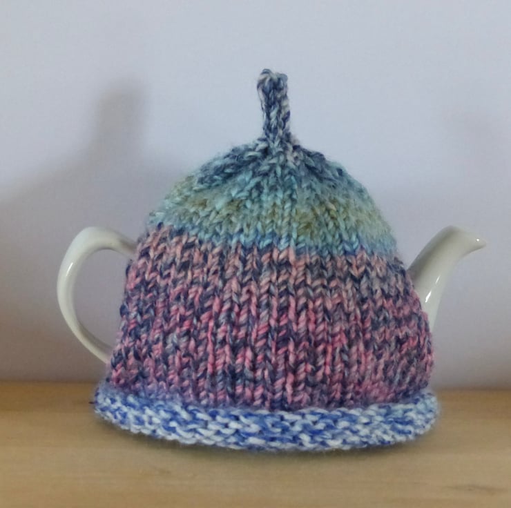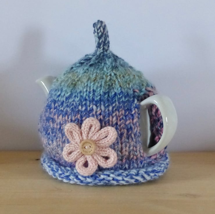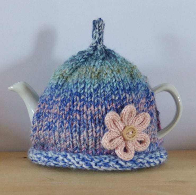 A hand knitted Tea Cosy in a chunky variegated yarn in shades of Blue and Pink and a hint of Sage Green. It has a pixie top and a french knitted flower in a Pale Peach colour with a natural wood "Handmade With Love' button in the centre.