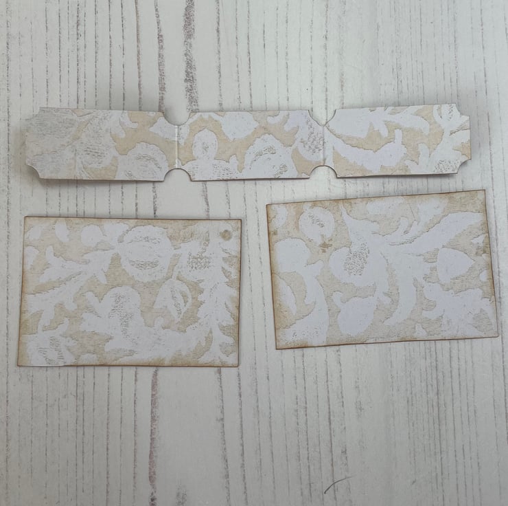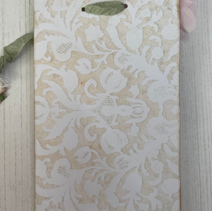 Shabby chic loaded tag pocket. Background vintage style rose print with rose print pockets. Edged with lace, green bias binding ribbon bow and a pretty pink flower on the front. Fussy cut clock and floral addition. The pockets have 2 larger tags with lace at the top. Smaller pocket holds 2 journal cards and a set of tickets. Measures 7” x 4”