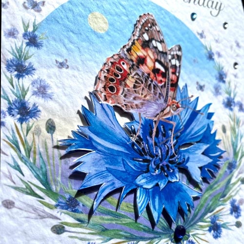 This beautiful Birthday Card is perfect to wish someone special a wonderful Birthday! Thinking of Summer wild flower meadows with lots of bees and butterflies, this gorgeous ‘Painted Lady Butterfly’ has settled on a stunning blue cornflower. Set in a circular scene with the sun shining in a blue sky, the flower and butterfly are hand-cut and mounted in relief on the card. This hand painted glimpse of nature comes to life, with a few glass gems for decoration.
