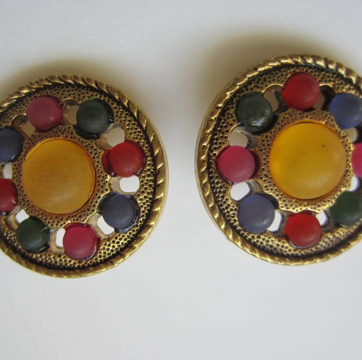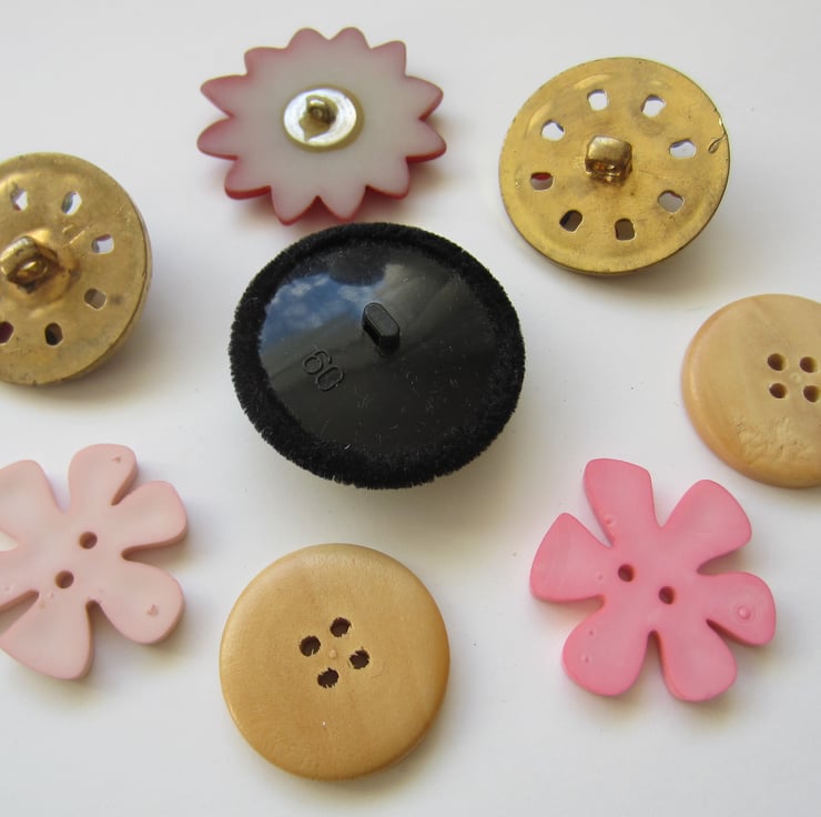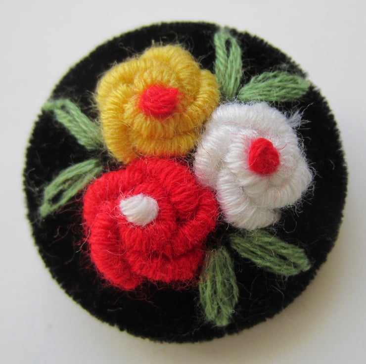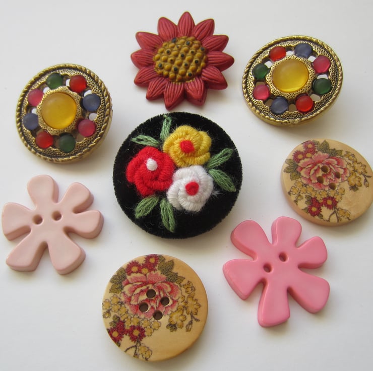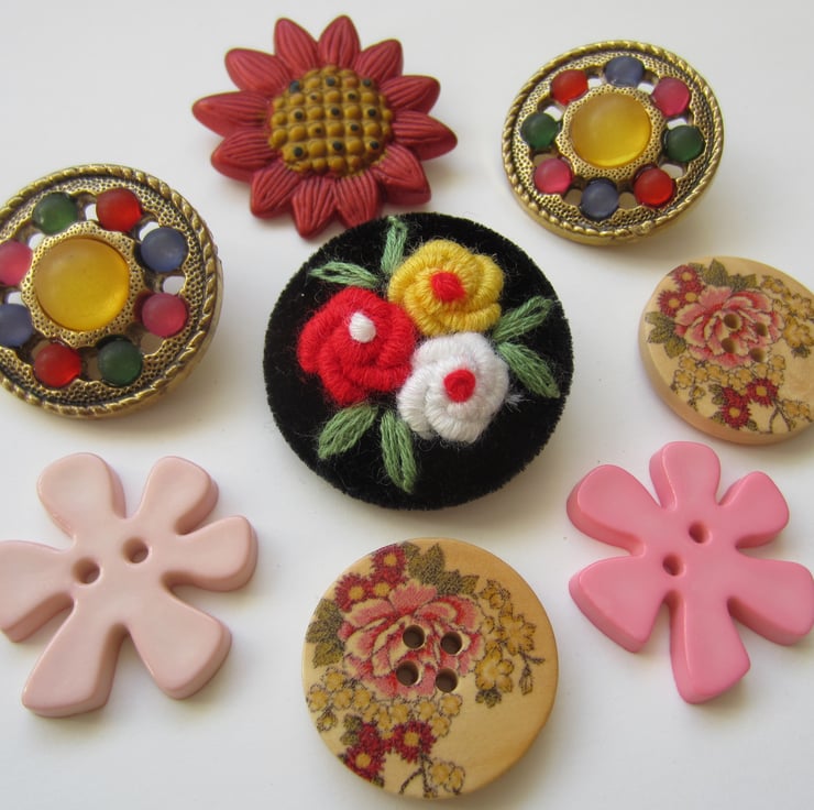 The largest button, the black velvet fabric covered button with embroidered flowers measures 4 cm across.