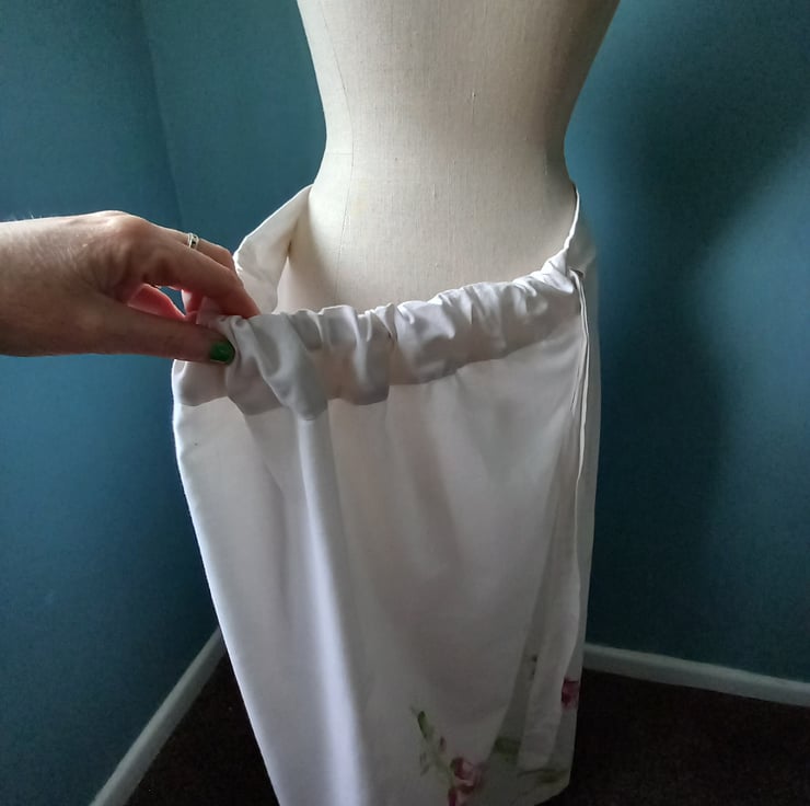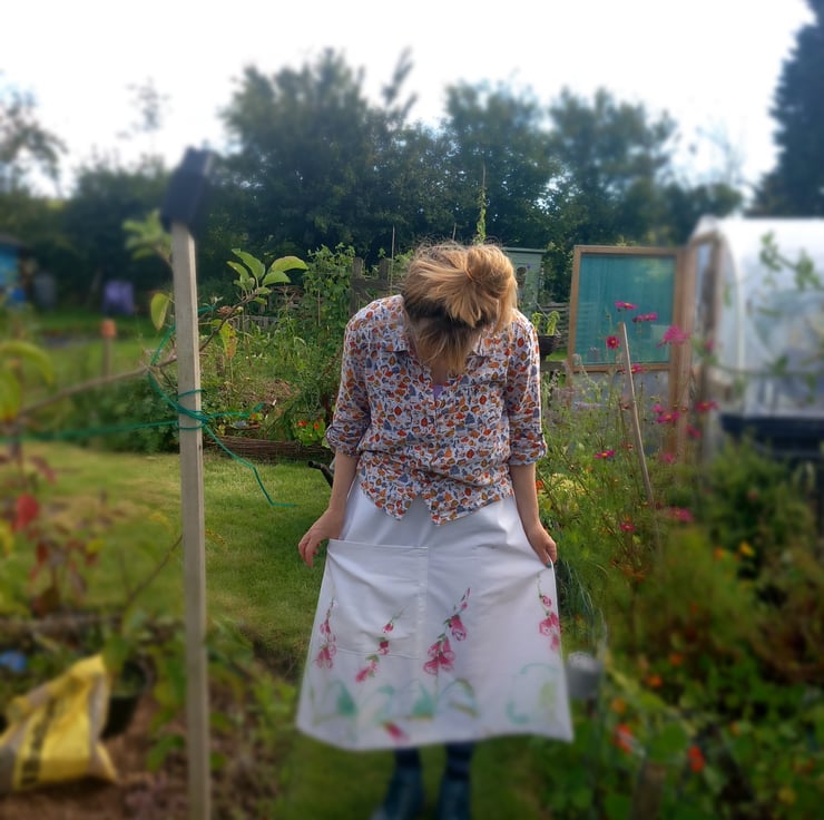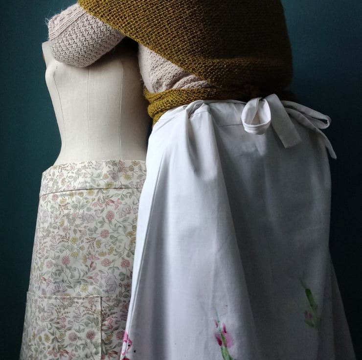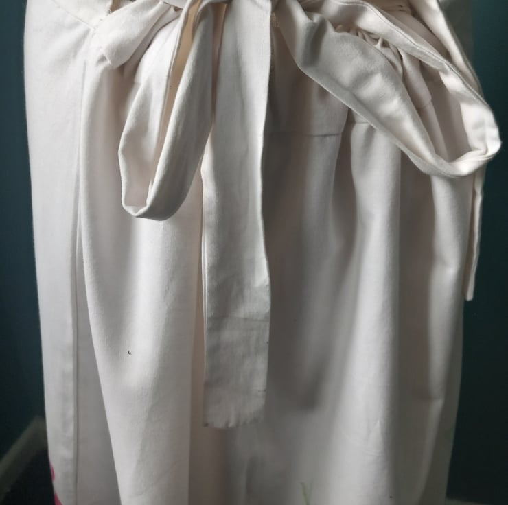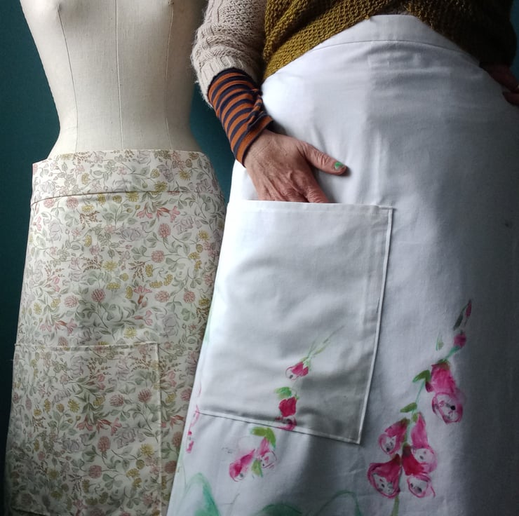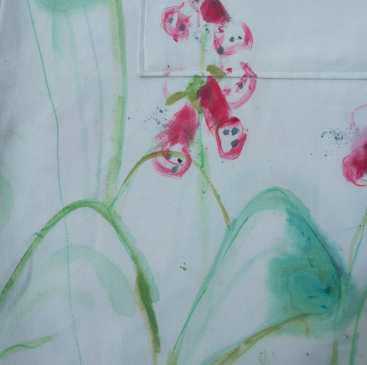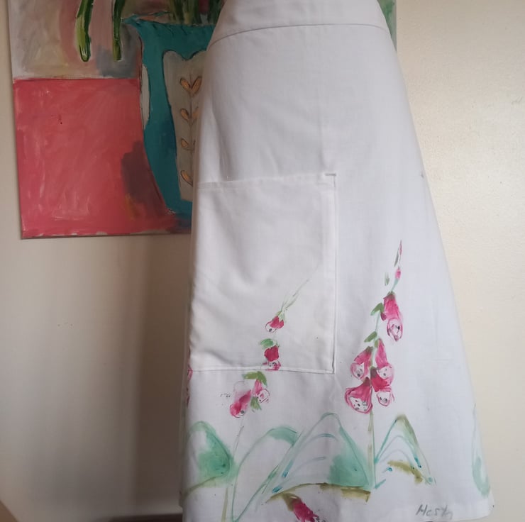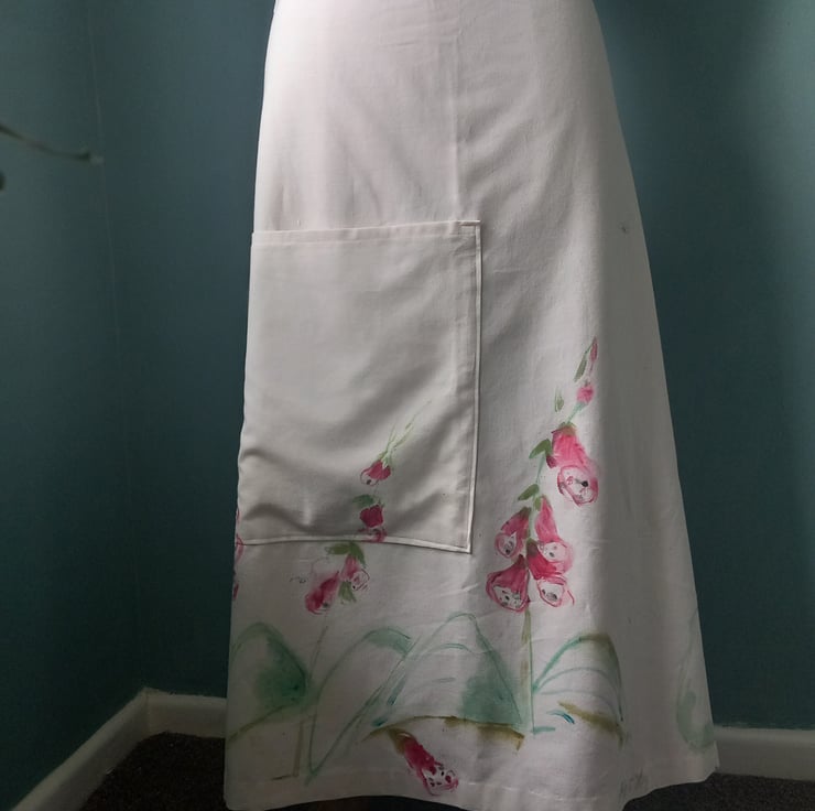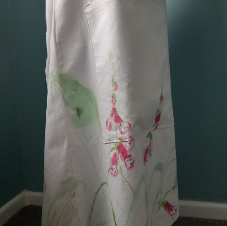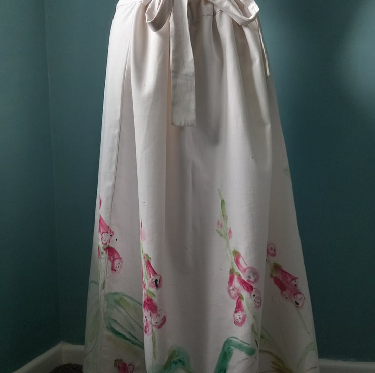 This clever design is neatly made, adjustable as pulls together at the back into a gather. Fits from a size 10 to a size 14 with a big over sized pocket and all seems overlocked. Beautiful soft cotton fabric with floral foxgloves hand painted in fabric paint , then fixed . Easy to hand wash . Measuring 76cm from top of waist band. Ps this one looks nice with a petticoat underneath now reduce as this is a lighter summer skirt