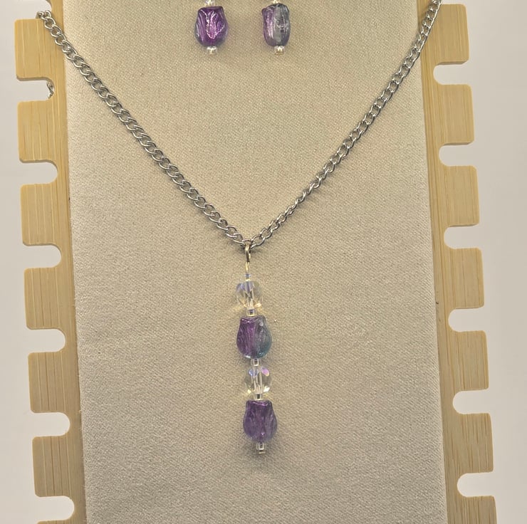 The necklace is made using chain and the earrings are on stirling silver hooks. The earrings can be made a clip-on, please just ask for them to be changed when you order.